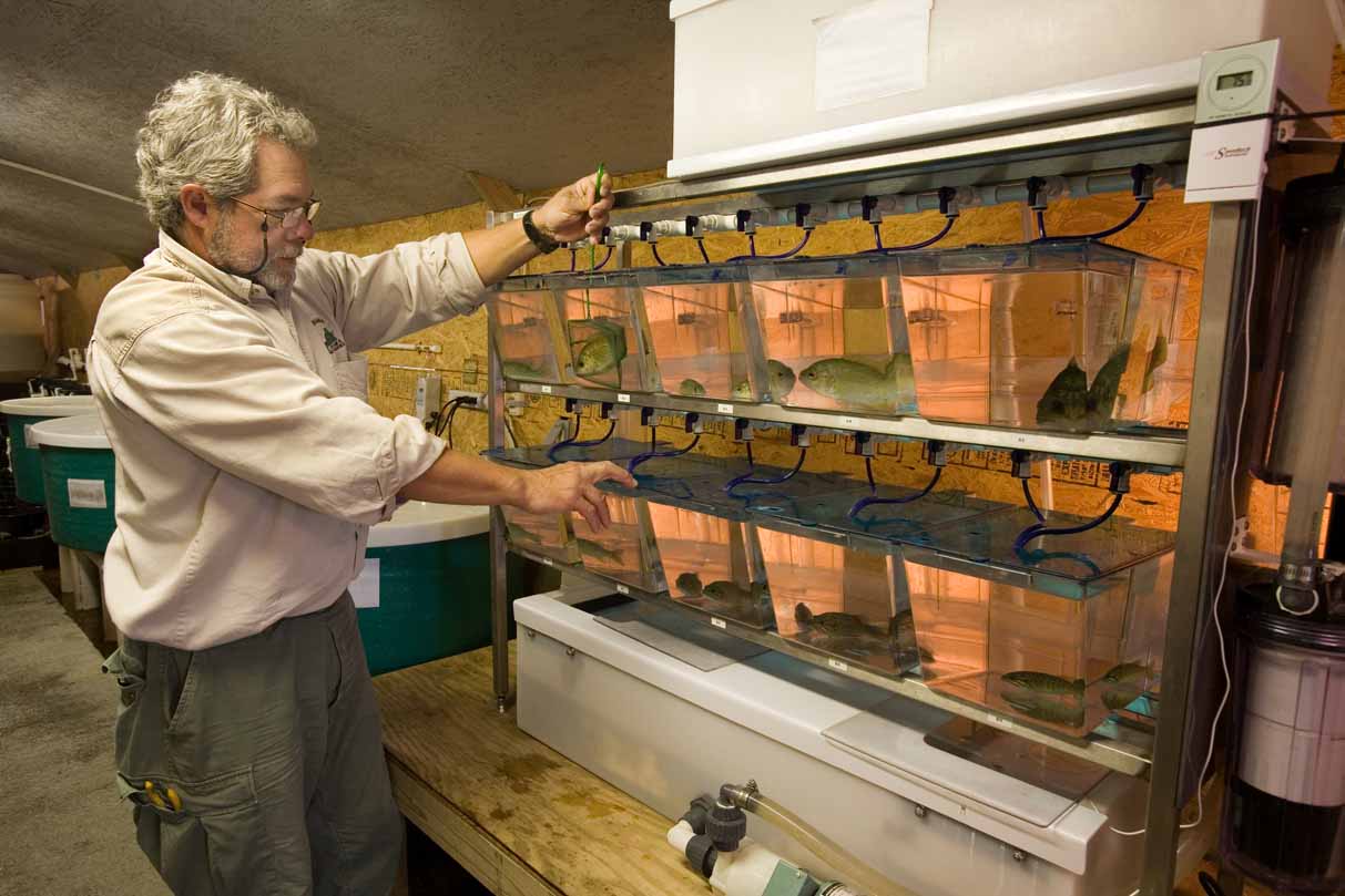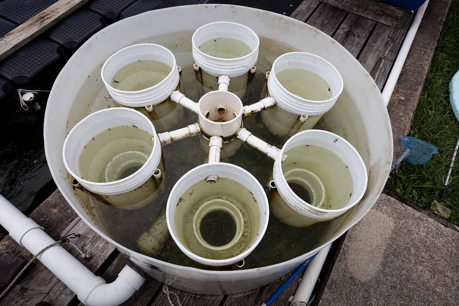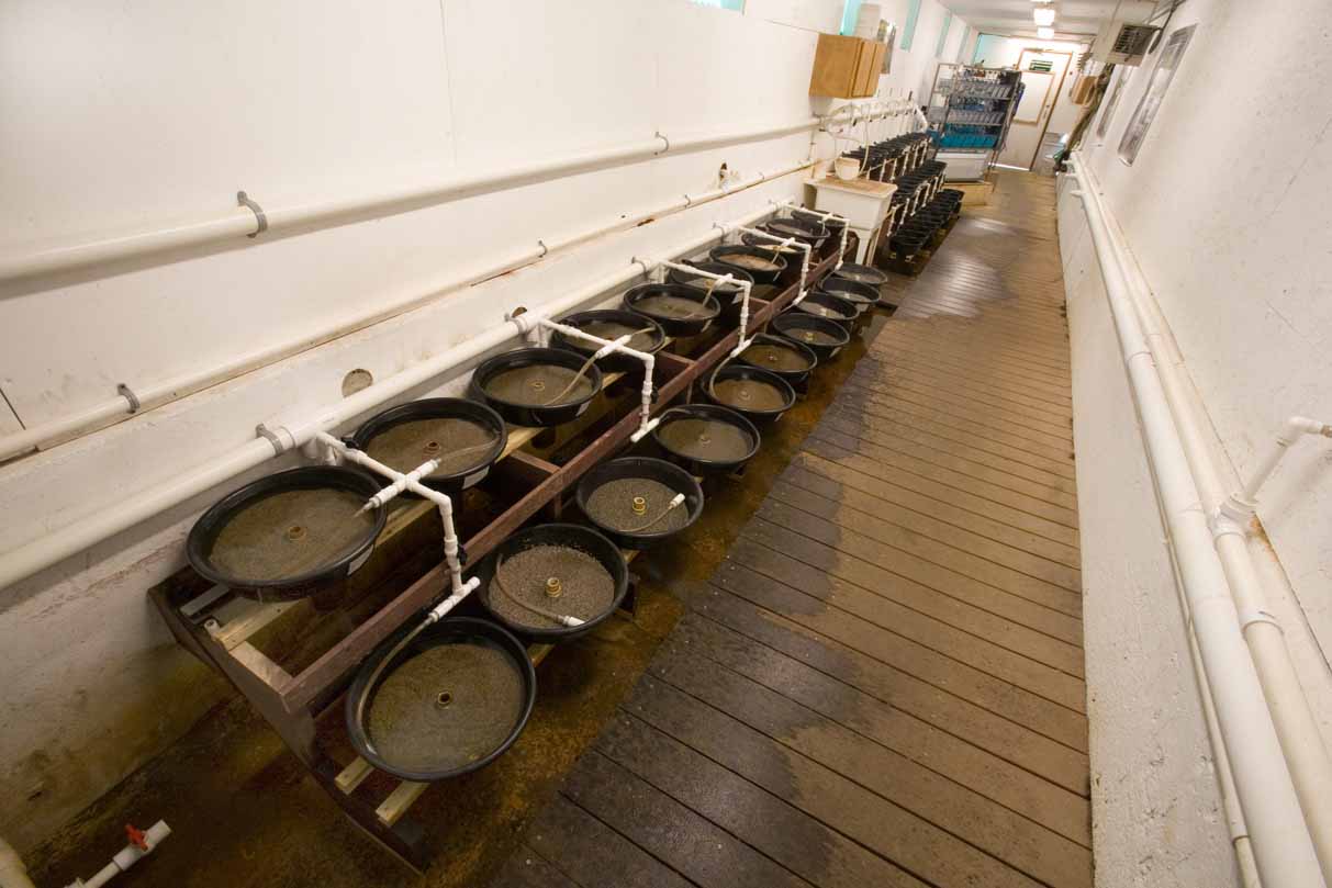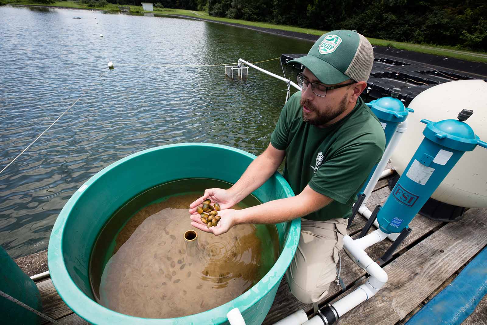 Lorsque les moules juvéniles tombent des poissons hôtes, elles sont comptées et placées dans des systèmes d'élevage pour leur permettre de grandir suffisamment pour augmenter leurs chances de survie dans la nature. Les systèmes d'élevage comprennent des réservoirs avec substrat alimentés par de l'eau filtrée provenant des étangs de l'AWCC. L'eau est filtrée afin d'éliminer les prédateurs qui pourraient consommer les petits juvéniles. Leur régime alimentaire composé d'algues et de bactéries se développant naturellement est complété par des algues marines commerciales. L'AWCC développe et teste constamment de nouveaux systèmes et méthodes d'élevage des moules juvéniles afin d'atteindre des taux de croissance et de survie optimaux.