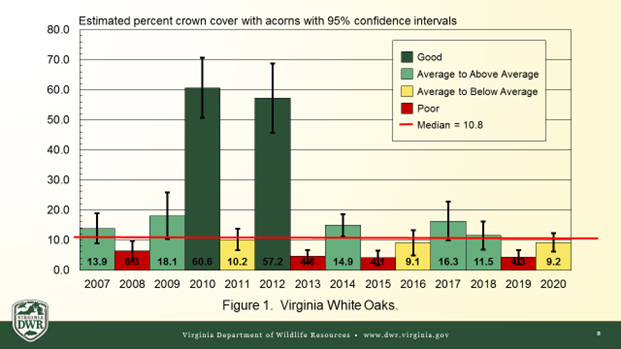 Les lecteurs doivent savoir que les évaluations de l'abondance des mâts sont censées refléter les moyennes régionales, mais que les cultures de mâts ne sont pas uniformes dans une région donnée. L'abondance des glands peut varier entre des zones locales qui ne sont distantes que de 10-15 miles. De manière anecdotique, la récolte de glands (en particulier pour le chêne blanc) semble être supérieure à la moyenne dans certaines régions de l'État. Le scoutisme s'avérera une fois de plus utile aux Virginiens qui sortiront cet automne, avec ou sans arme, pour profiter de la faune et de la flore sauvages et peut-être récolter un cerf, un ours ou une dinde sauvage.