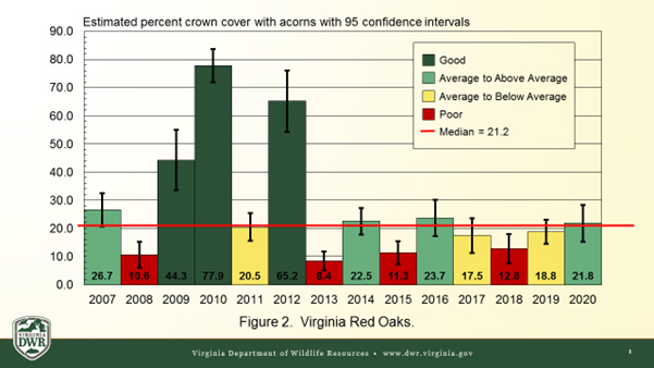 Il semble y avoir peu de choses normales sur 2020, mais l'une d'entre elles est la production de glands en Virginie ! Nos enquêtes ont révélé que les récoltes de glands de chêne blanc et de chêne rouge étaient proches de la médiane à long terme sur le site 2020. Au total, 31 sites d'étude ont été échantillonnés à travers le Commonwealth sur 2020 par le personnel du DWR et de nombreuses organisations partenaires et bénévoles.