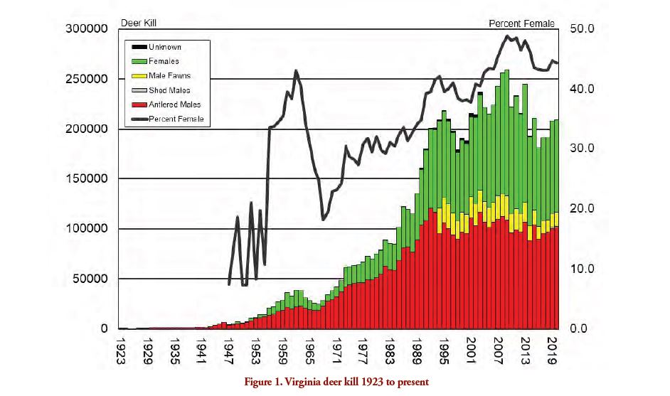 Au cours de la dernière saison de chasse au cerf, 209,356 cerfs ont été tués par des chasseurs de cerfs en Virginie (Figure 1). Ce total comprenait 101,509 mâles avec bois, 13,637 mâles avec boutons, et 93,005 femelles (44% femelles). Le tir à l'arc (y compris les arbalètes) a représenté 14% de l'abattage des cerfs ; les armes à chargement par la bouche, 23% ; et les armes à feu, 63% .