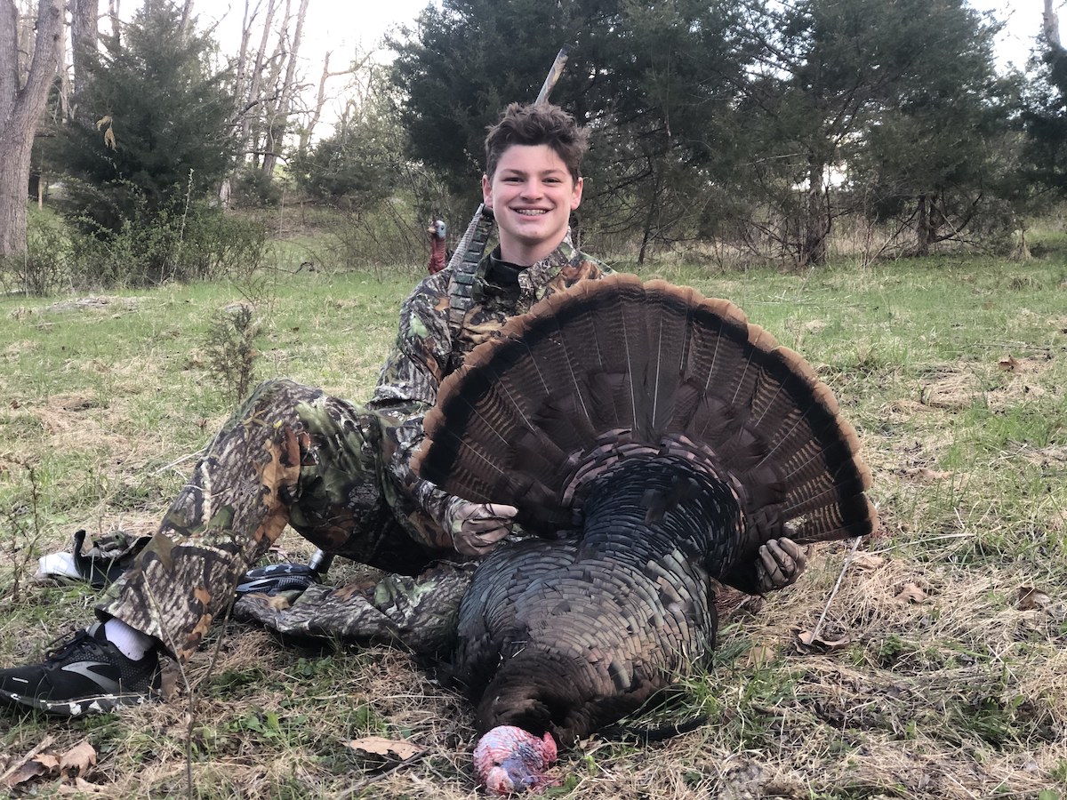 "Quelques minutes après notre installation, nous avons essayé d'autres cris de poules et nous avons été à nouveau choqués d'entendre un gobage fort et rauque tout près de nous. Nous sommes restés assis tranquillement pendant près de 20 minutes, jusqu'à ce que Grant dise soudain : "Le voilà !". Le gros gobbler adulte était en pleine action alors qu'il s'approchait rapidement de nos leurres depuis la ligne de crête au-dessus de nous (l'endroit même d'où nous venions de déménager). Grant a réglé la bille du fusil et a effectué un tir parfait, déposant l'oiseau entre les leurres. Nous étions ravis au-delà de toute mesure ! Aucun de nous deux ne pouvait croire que, lors de notre toute première chasse à la dinde pour les jeunes, nous avions réussi à capturer ensemble un dindon adulte. Grant a fait remarquer que "dans la chasse au cerf, c'est presque comme si la situation se déroulait autour de vous et que vous n'interagissiez avec l'animal que lorsque vous tirez. La chasse à la dinde est différente. Vous êtes la situation et vous interagissez avec l'animal pendant toute la durée de la chasse". La dinde pesait 23.5 pounds, avait une barbe 11 1/4″ et des éperons mesurant 1 1/4″ et 1 5/8″. C'était vraiment la dinde d'une vie !".
