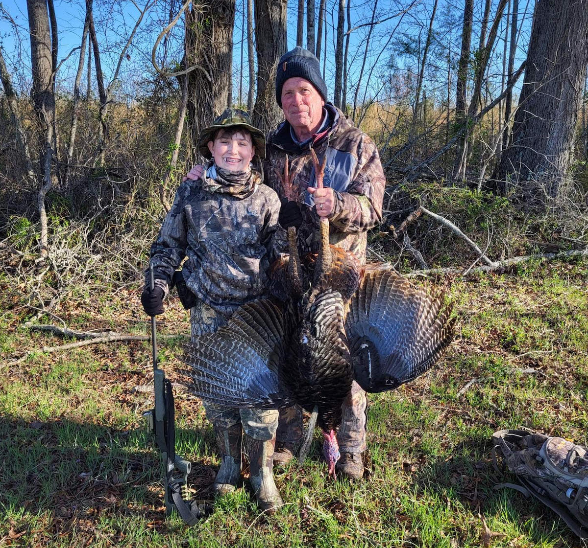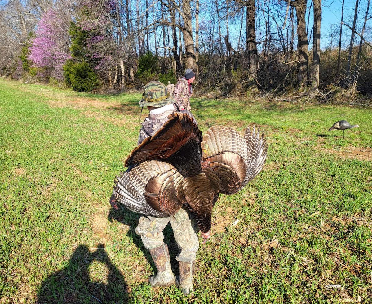 Ian Ostlund, agent de la police de la conservation du DWR (K9 ), écrit : "J'ai emmené mon fils de 14ans, Grant, à sa première chasse à la dinde pour les jeunes près de notre maison dans le comté de Rockingham. Nous n'avions jamais vu ni entendu un coq de bruyère sur la propriété que nous chassions, mais nous avions vu une poule de temps en temps. Aux premières lueurs de l'aube, nous avons tous deux été choqués d'entendre presque immédiatement des glouglous en réponse à nos appels de corbeaux. Après avoir installé nos leurres et pris position au pied d'un grand chêne, les gobblers ont continué à répondre à nos séduisants appels de poules, mais semblaient travailler plus loin de nous, et ont finalement cessé de glouglouter. Nous avons décidé de changer d'endroit et de nous installer dans un tunnel de terrain situé ailleurs sur la propriété, à l'abri des rafales de vent.