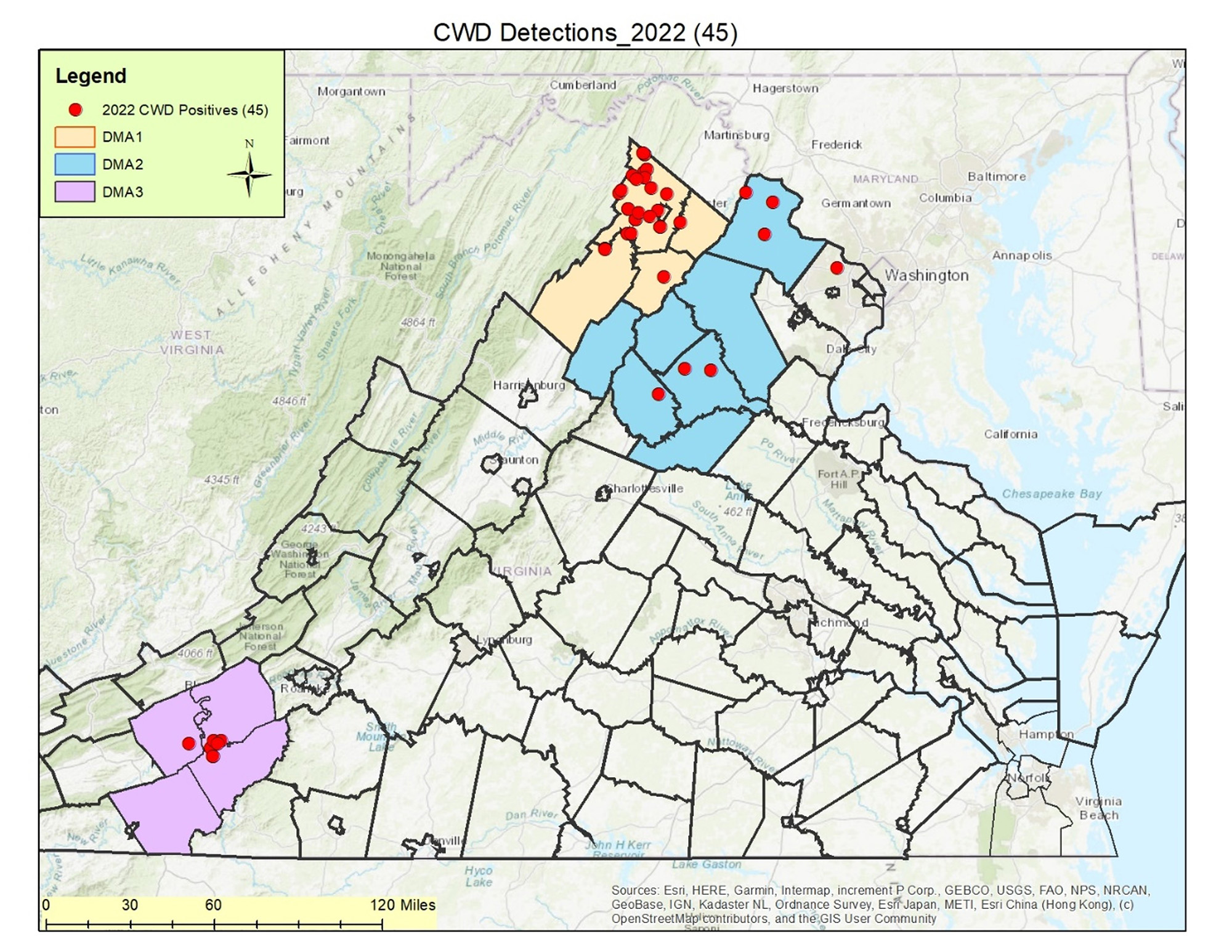 Comme indiqué précédemment, les limites de la DMA2 seront élargies pour la saison 2023 afin d'inclure les comtés d'Arlington, de Fairfax et de Prince William en raison d'une détection dans le comté de Fairfax au cours de la saison 2022. Dans le reste de la DMA2, un total de 1,757 échantillons ont été prélevés pendant la saison de chasse 2022. D'autres détections positives ont été relevées à Loudoun (3), Culpeper (2) et Madison (1). La maladie du dépérissement chronique n'a pas encore été détectée dans les comtés d'Orange ou de Page, mais ce n'est probablement qu'une question de temps.