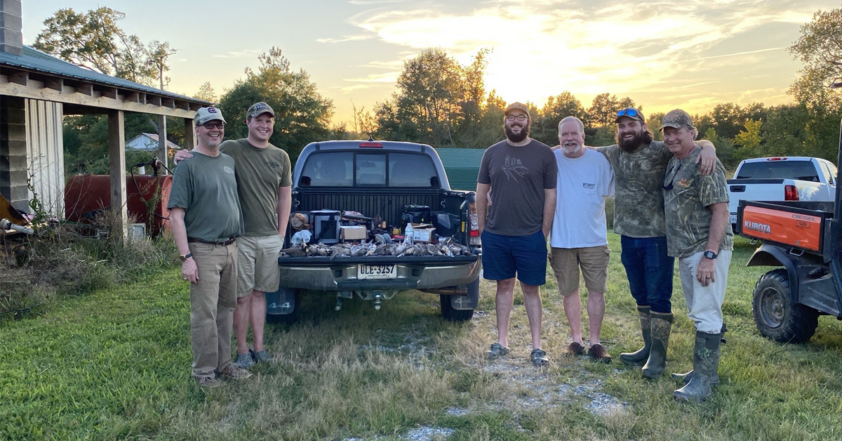 Trois groupes de pères et de fils le jour de l'ouverture de la chasse à la tourterelle 2021 dans le comté d'Amelia, en Virginie. De gauche à droite, Mike et Jonathan Bowman, Whit et Bubba Bates, et Landon et Mike Boisseau.