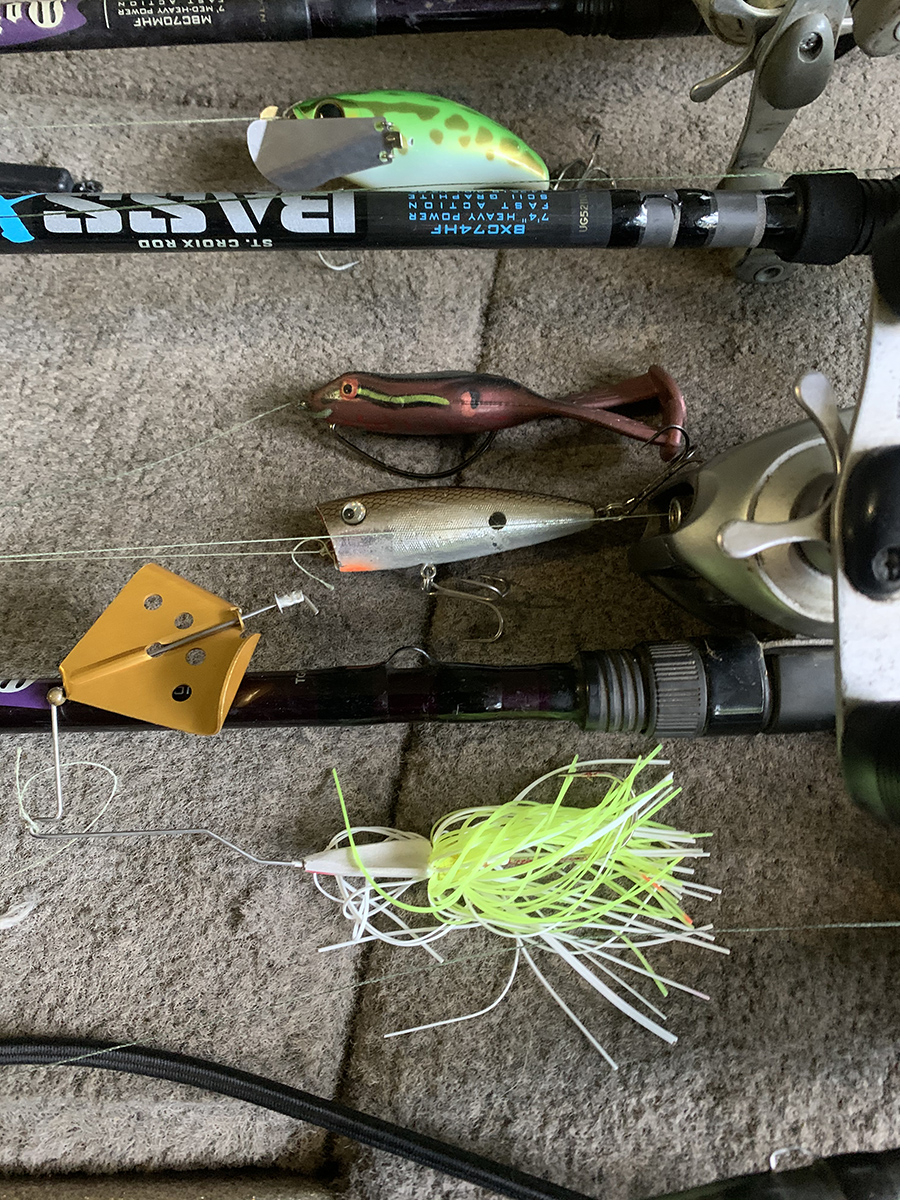 Je cherche des herbes peu profondes, des bâtons, des quais - tout ce qui peut contenir un poisson - et j'essaie d'atteindre autant de cibles que possible avant que le soleil ne se lève. Ici, rien ne couvre mieux l'eau qu'un buzz bait, et si vous manquez un poisson, un suivi rapide avec le popper peut transformer les prises manquées en poissons supplémentaires. Je lance un buzz bait chartreuse et blanc et un popper couleur shad. Si je pêche dans un endroit où il y a de gros poissons, comme la rivière Chickahominy, j'ai tendance à lancer le crawler. Cette pêche est généralement terminée lorsque le soleil se lève, mais elle peut durer toute la journée s'il pleut. J'aime 40 lb. pour un popper et 50lb. tresse pour les buzz baits et les crawlers. La tresse n'est pas extensible et permet de mieux ferrer les appâts de surface.