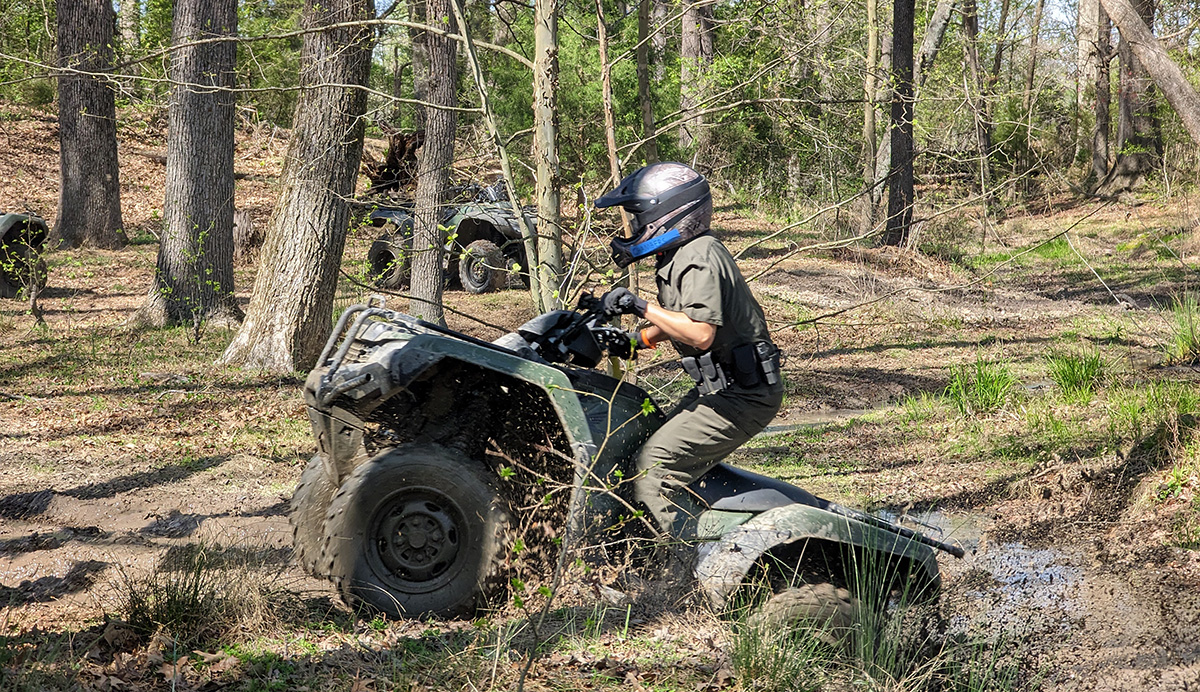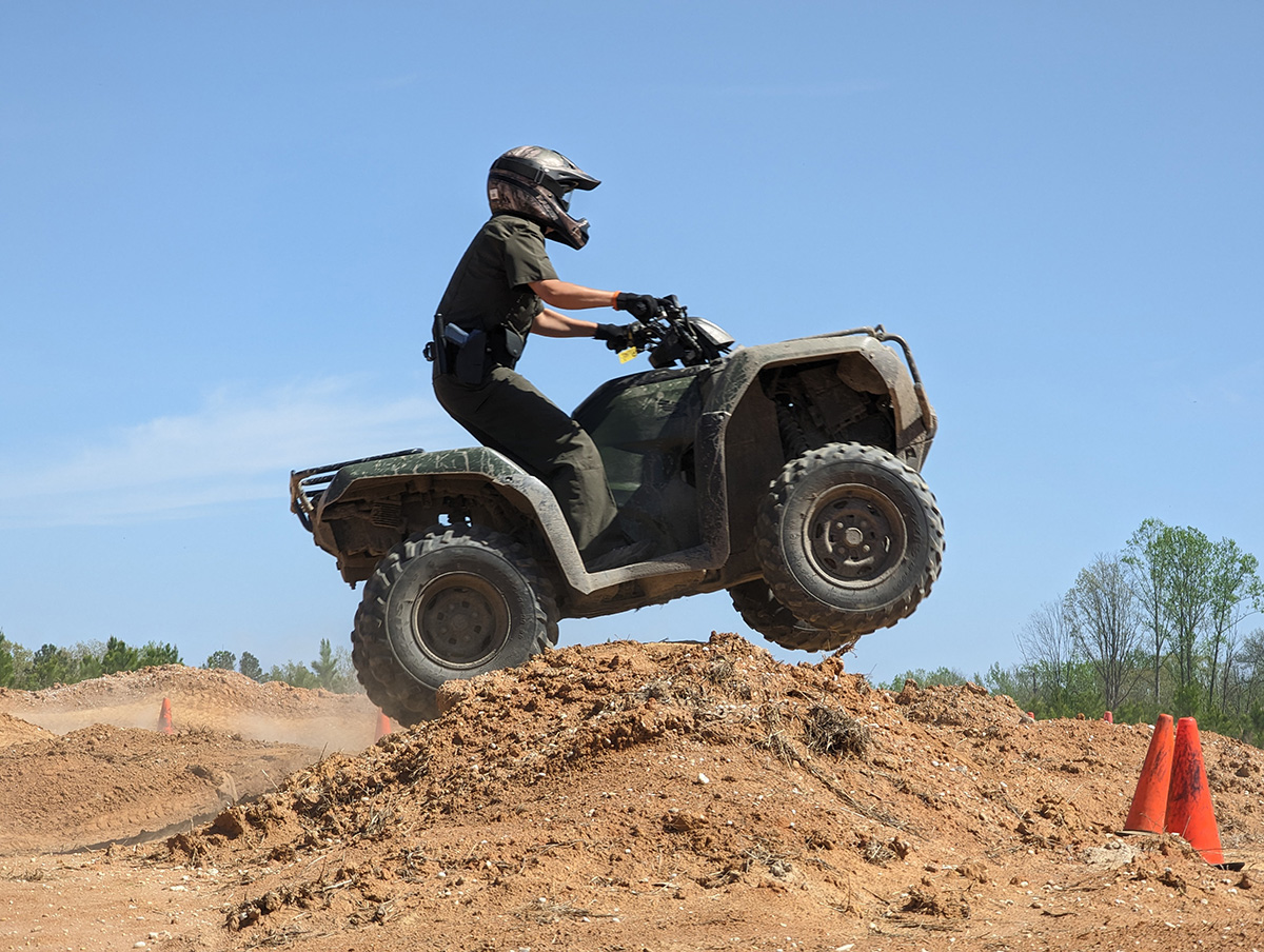 Les recrues ont passé une semaine et demie au cours de formation à la conduite pour apprendre à conduire divers véhicules de patrouille. Les recrues suivent plusieurs cours différents, notamment le cours de conduite de base, le cours de marche arrière, le cours de freinage de contrôle, le cours de changement rapide de voie et le cours de conduite d'urgence, entre autres. Les recrues apprennent à manœuvrer les remorques et à faire marche arrière dans le cadre de divers cours, ce qui est essentiel pour la variété des bateaux qu'ils devront remorquer à travers l'État une fois qu'ils seront sur le terrain. Dans le cadre de la carrière de CPO dans les bois, les recrues acquièrent les compétences nécessaires à la conduite tout-terrain. Les recrues ont également acquis des compétences de base en matière de conduite de VTT et d'UTV, qui sont essentielles pour patrouiller dans les forêts éloignées de l'État et les forêts nationales dans les montagnes de l'État.
