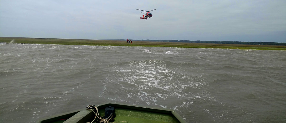 Les officiers arrivent et localisent les plaisanciers à peu près en même temps que l'hélicoptère de l'USCG. Le bateau Bass Tracker ( 17) a été submergé par les conditions de mer difficiles et le vent violent et s'est échoué dans le marais. Les occupants sont sortis du bateau et se tiennent debout dans le marais qui est en train d'être inondé par la marée montante. Les agents Bratton et Murray ont coordonné leur action avec celle du nageur-sauveteur et de l'équipage aérien de l'USCG pour évacuer les plaisanciers du marais, sécuriser le navire et ramener les plaisanciers sur la terre ferme.