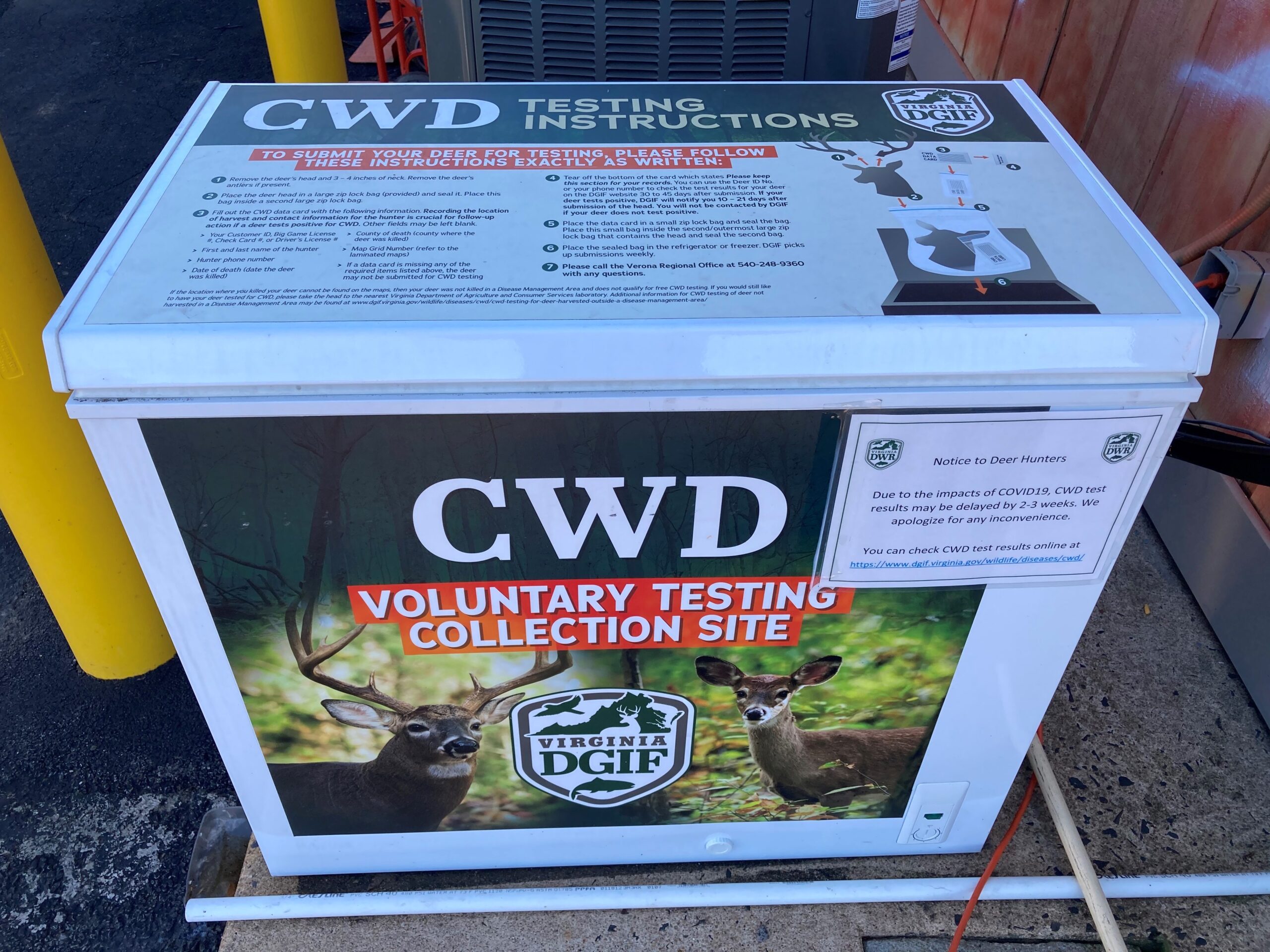 Le 16 novembre, lorsque la saison générale de chasse au cerf à l'arme à feu débutera, le DWR mettra en place des sites de dépistage obligatoire dans les comtés de Shenandoah, Carroll, Patrick, Franklin, Tazewell, Wythe et Pulaski, où les chasseurs pourront amener leurs cerfs pour qu'ils soient testés pour la maladie du dépérissement chronique (Chronic Wasting Disease ou CWD en anglais). Tous les cerfs tués dans ces comtés ce jour-là doivent être apportés à une station d'échantillonnage CWD (ouverte de 8:00 a.m. à 7:00 p.m.) ou à l'une des stations frigorifiques DWR ouvertes 24/7. Les chasseurs peuvent déposer la tête et environ trois à quatre pouces du cou aux stations de réfrigération. Les instructions pour la soumission des têtes sont fournies sur ces sites.