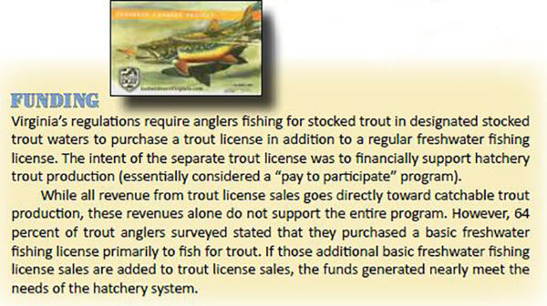 L'ensemencement de truites élevées en écloserie dans un cours d'eau ou une petite retenue d'eau est totalement artificiel et peut donc être manipulé de nombreuses façons. Où et quand les truites sont ensemencées, la taille et le nombre de poissons ensemencés, et comment et quand les pêcheurs sont informés de l'ensemencement des truites sont des options de gestion que le DWR utilise dans son programme d'ensemencement des truites. Le DWR a répondu aux demandes des pêcheurs de truites ensemencées de Virginie. Au cours des trois dernières décennies, le DWR a apporté des modifications au programme général de repeuplement et a lancé plusieurs autres programmes spécifiques pour répondre aux besoins sociaux et démographiques de la communauté des pêcheurs à la ligne de truites ensemencées.