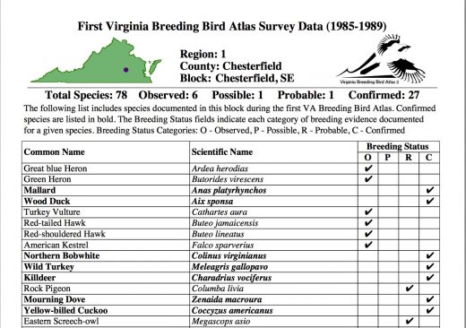 Les listes d'espèces et les données sur le statut de reproduction sont désormais disponibles pour chaque bloc étudié dans le cadre du premier Atlas des oiseaux nicheurs de la VA via l'outil Atlas Block Explorer. Cet effort s'est déroulé de 1984à1989, et près de 30 ans se sont donc écoulés depuis la collecte de ces données. De nombreux changements sont intervenus dans le paysage de la Virginie, ce qui explique pourquoi la deuxième VA BBA est si importante pour la conservation des oiseaux de la région. Les données collectées aujourd'hui seront comparées à celles du premier Atlas afin d'identifier les changements dans la répartition des oiseaux nicheurs dans l'État. Ces distributions peuvent ensuite être superposées aux données sur l'utilisation des terres pour nous aider à mieux comprendre comment les différentes espèces d'oiseaux ont réagi à l'évolution de la Virginie.