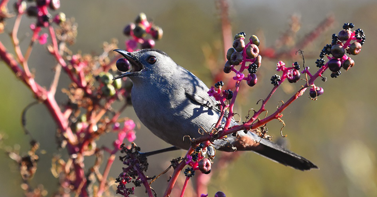 Un oiseau-chat se régalant de baies de pokeweed. Photo de Betty Sue Cohen