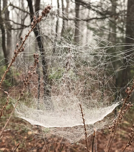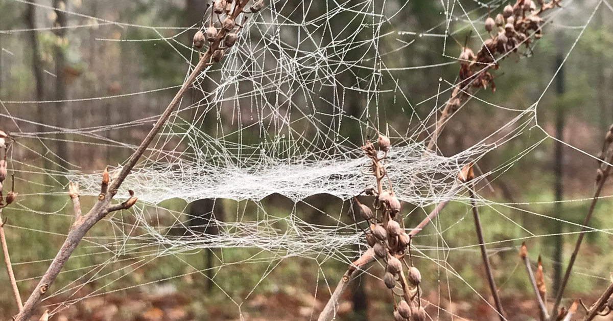 Je me sens un peu comme Dorothée ouvrant la porte du pays d'Oz, car dès que je sors, je vois des centaines de petites toiles d'araignées dessinées par la brume montante de la pluie de la nuit dernière.