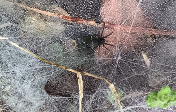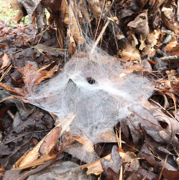 Certaines toiles sont au sol, nichées parmi les feuilles séchées que je n'avais volontairement pas ramassées l'automne dernier, car les feuilles mortes constituent un habitat extrêmement important pour de nombreuses espèces de faune et de flore. Les feuilles fournissent une structure pour les toiles des araignées tisseuses d'entonnoirs. Vous pouvez voir que chaque toile comporte un petit trou où l'araignée se cache pour attendre, toujours prête à recevoir la moindre vibration d'un insecte qui pourrait se trouver là et devenir son petit déjeuner du matin. Les araignées doivent aussi manger, vous savez.