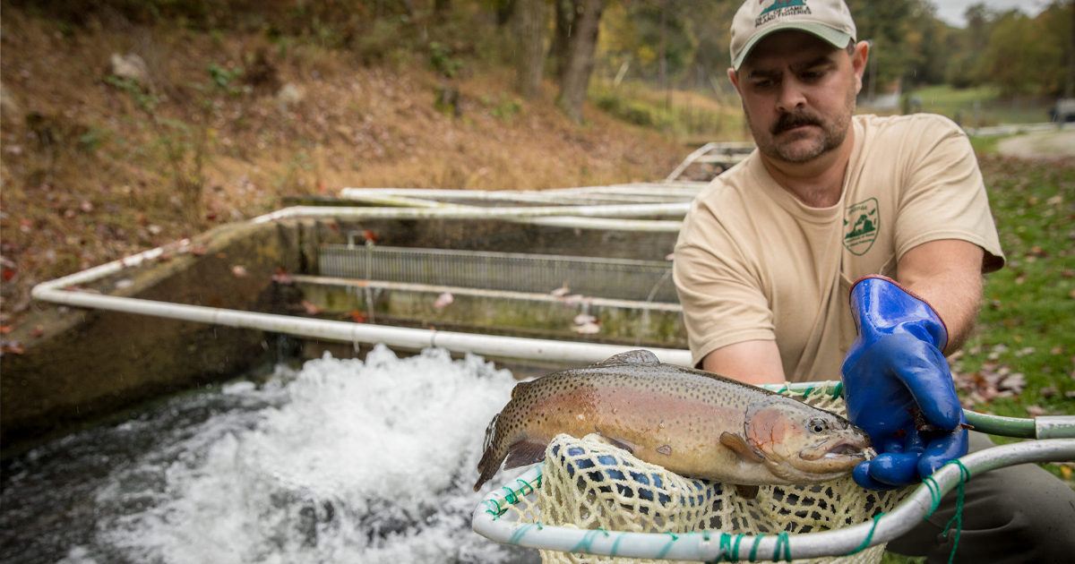 Le DWR gère quatre écloseries d'eau chaude(King and Queen dans le comté de King and Queen, Front Royal dans le comté de Warren, Buller dans le comté de Smyth et Vic Thomas dans le comté de Campbell) où des techniciens d'écloserie et des biologistes élèvent et stockent une grande variété d'espèces. Il existe également cinq écloseries d'eau froide consacrées à l'élevage et au lâcher de truites : Marion dans le comté de Smyth, Paint Bank dans le comté de Craig, Wytheville dans le comté de Wythe, Coursey Springs dans le comté de Bath et Montebello dans le comté de Nelson. "En ce qui concerne la truite, nous produisons et remettons à l'eau des poissons de taille capturable, généralement 10 pouces et plus. Vous devez être titulaire d'une licence de pêche à la truite pour participer au programme de pêche à la truite avec remise à l'eau. En ce qui concerne les eaux chaudes, nous élevons et stockons des poissons juvéniles, des alevins", a déclaré M. Delbos.