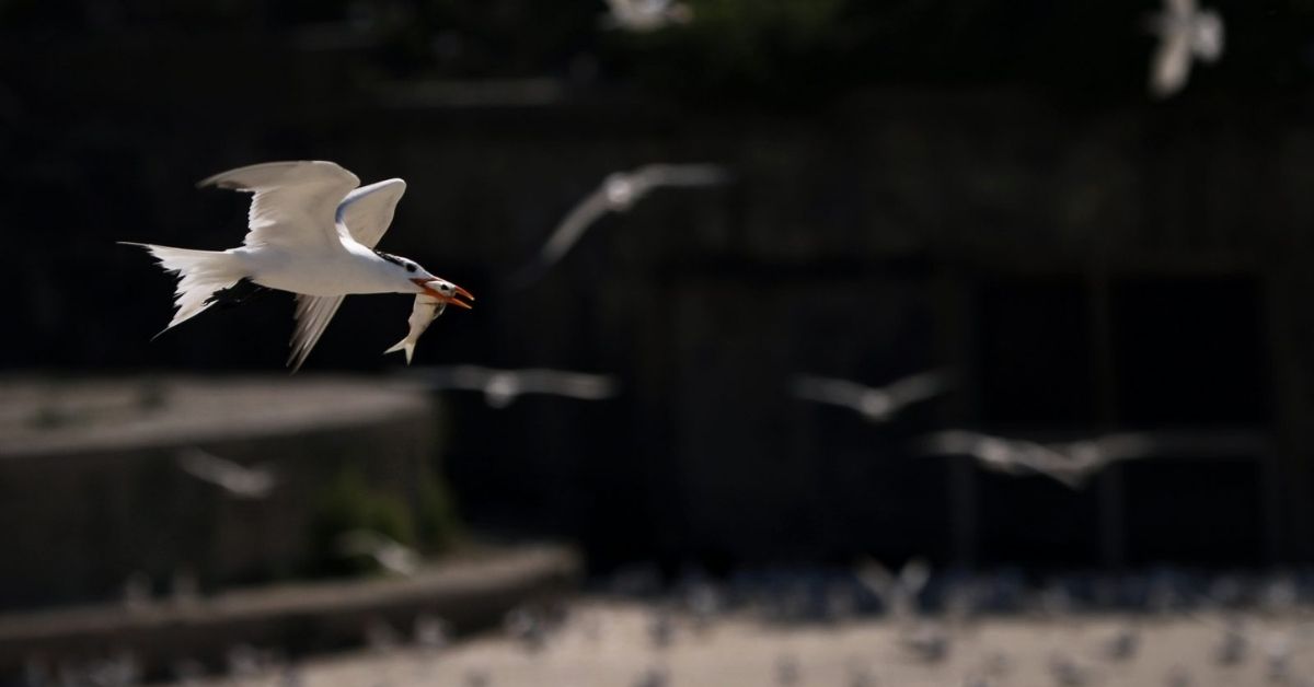 Une sterne royale adulte vole au-dessus de Ft. Laine portant un poisson (Clupeid sp.). Crédit photo : Aileen Devlin/Virginia Seagrant