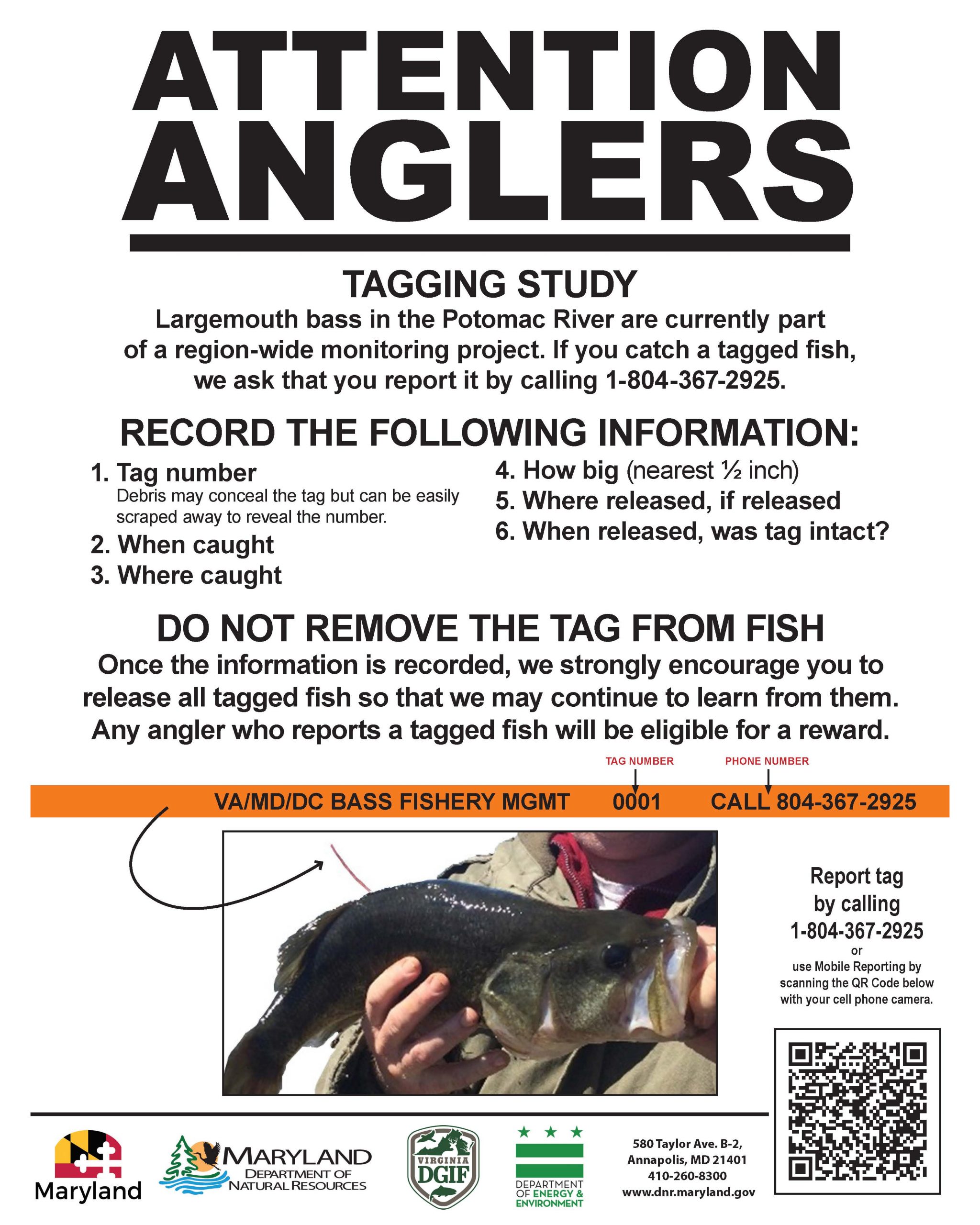 L'achigan à grande bouche dans les habitats d'eau douce influencés par les marées du fleuve Potomac sera capturé lors d'études par pêche électrique, puis mesuré, pesé, étiqueté et relâché. Les pêcheurs qui attrapent un poisson marqué peuvent communiquer le numéro de l'étiquette, la date de capture, la taille du poisson et les lieux de capture et de remise à l'eau. Les pêcheurs qui déclarent avoir capturé un poisson marqué participeront à une loterie annuelle pour gagner un prix. Ils peuvent appeler 804-367-2925 ou envoyer un courriel à basstag@dwr.virginia.gov pour laisser des informations.