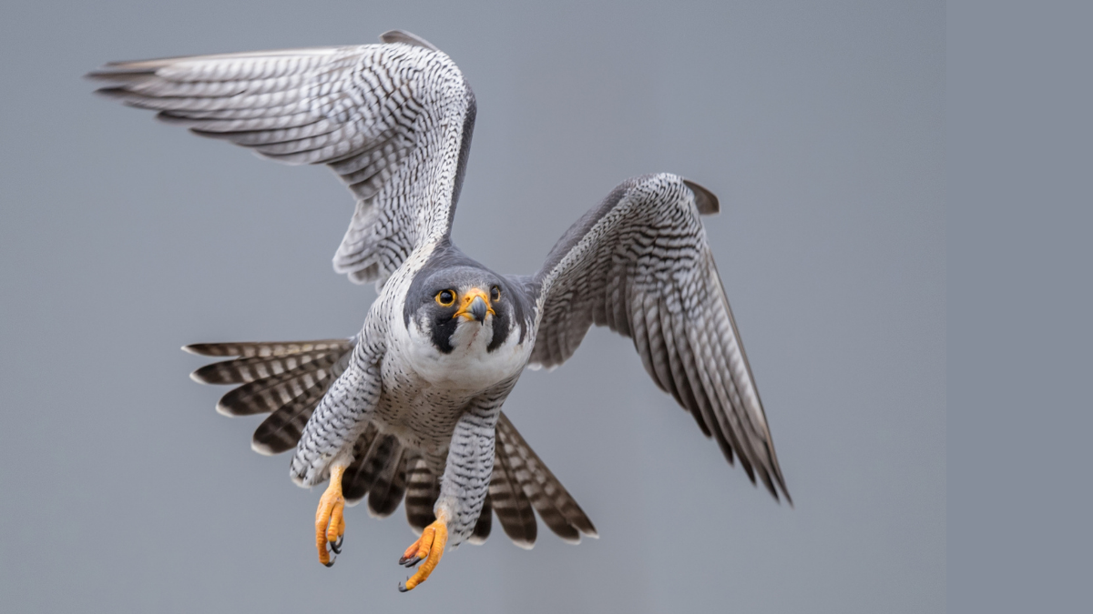 Un faucon pèlerin, l'oiseau le plus rapide du monde, prend son envol, révélant son magnifique plumage et ses marques distinctives. Photo par Shutterstock