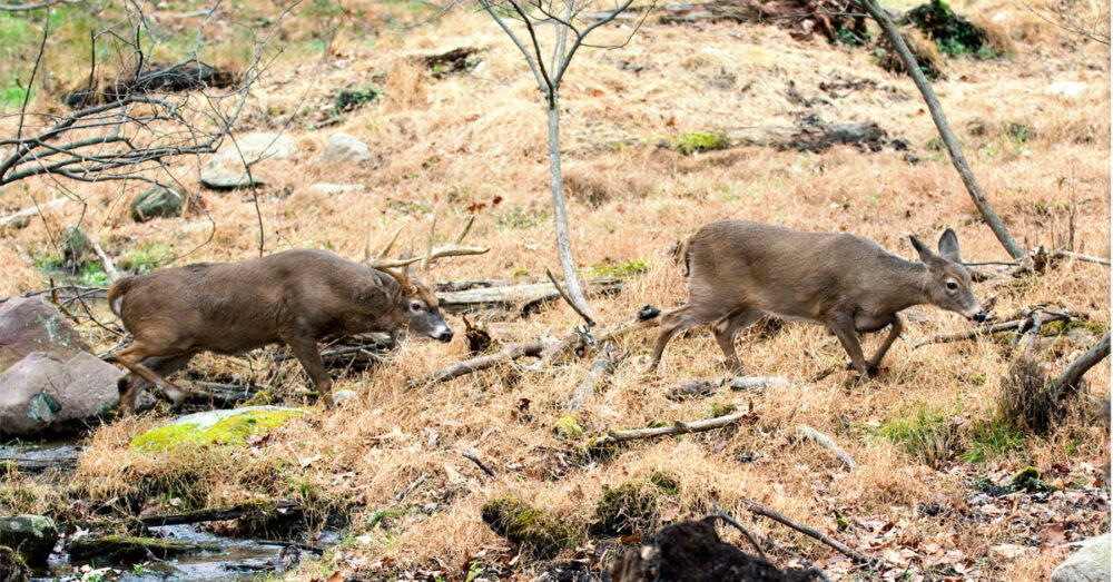 Le pic du rut du cerf de Virginie est déclenché par le calendrier photopériodique, c'est-à-dire la quantité de lumière du jour fournie dans une journée de 24heures qui tombe en novembre chaque année. Les chasseurs s'attendent à voir des mâles adultes poursuivre des femelles et défendre leur domaine vital pendant cette période. Cependant, il est tout à fait extraordinaire d'observer ce comportement agressif en janvier. Photo : Dr. Leonard Lee Rue III