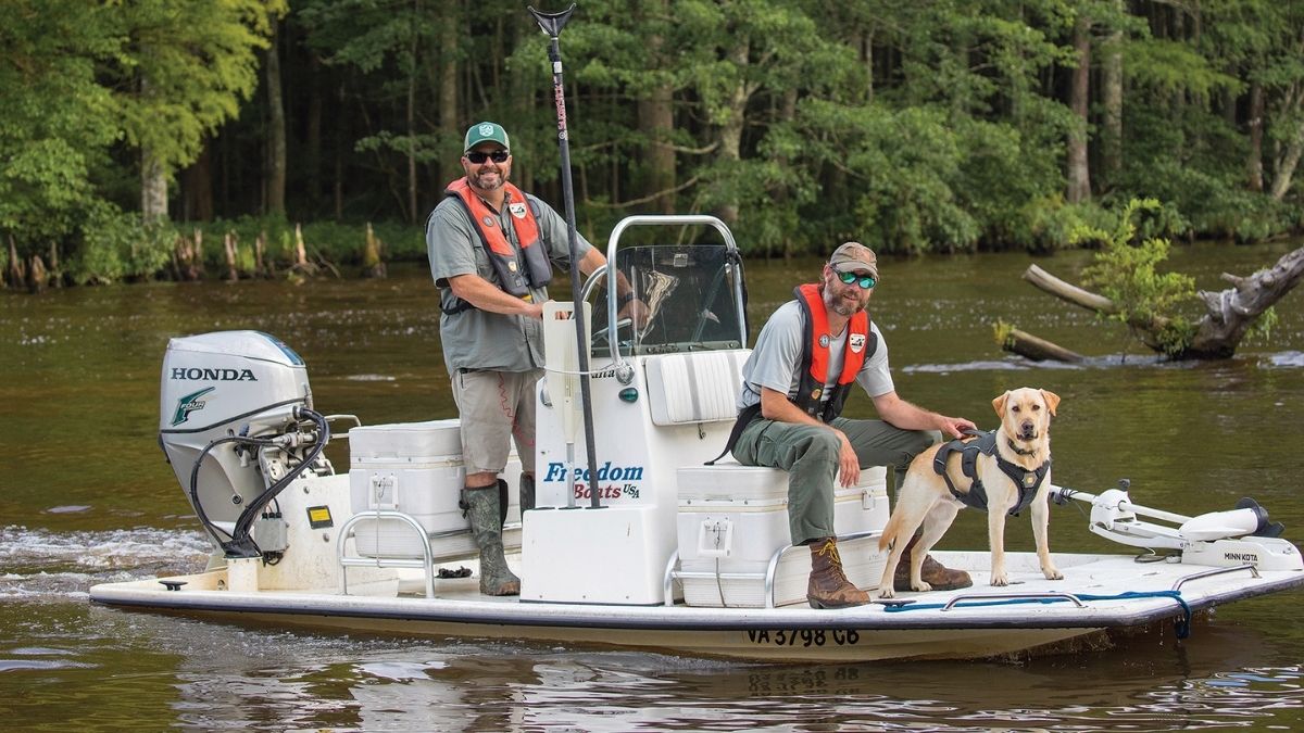 Les biologistes du DWR Todd Englemeyer (à la barre) et David Garst (tenant Finn, le chien détecteur de ragondins) en patrouille à la recherche de signes de ragondins.