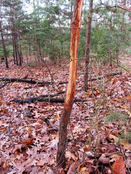 Les frottis sont plus faciles à trouver maintenant qu'à l'automne, lorsque les arbres sont recouverts d'un feuillage jaune et or. Recherchez les plus gros sur les arbres de la taille d'un poignet pour indiquer qu'un mâle adulte se trouve dans la région et essayez de suivre son itinéraire en vous basant sur les endroits où il a marqué d'autres arbres. Recherchez également les éraflures au-dessus desquelles se trouvent des branches lécheuses cassées. Il y a de fortes chances que les daims en fassent d'autres à proximité cet automne ou qu'ils reviennent pour les utiliser.