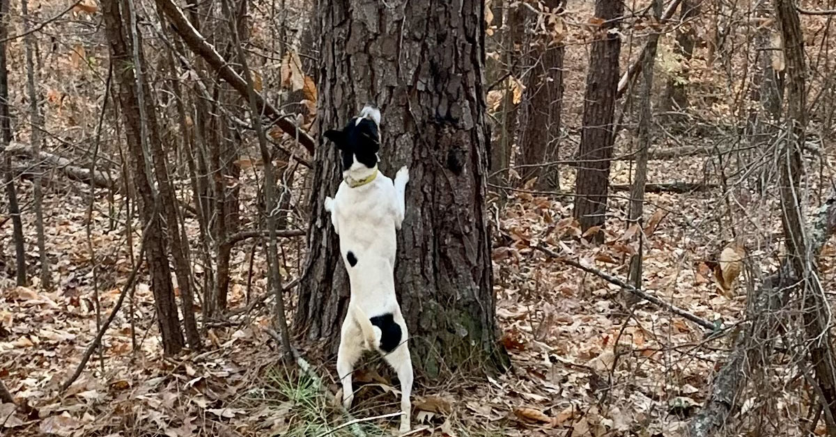 Heureusement, c'est là que se trouve l'écureuil. Le chien entre. Utilisant tous ses sens canins, Trapper a parcouru les bois à la recherche d'écureuils, souvent à bonne distance de nous. Lorsqu'il en trouvait un, il s'asseyait ou se tenait debout contre la base de l'arbre, regardant attentivement le ciel. Si l'écureuil se déplaçait vers un autre arbre - ce qui est connu sous le nom de "timbering out" - Trapper suivait rapidement sa silhouette à travers la canopée de la forêt.