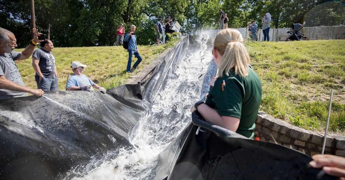 "Chaque année apporte de nouveaux défis", a déclaré M. Dahlem. "Cette année, nous avons utilisé un ancien revêtement de bassin pour transformer un escalier en pierre du parc en un toboggan à poissons de 50-foot afin d'amener les poissons du camion à l'eau avec le moins de stress possible pour eux (et pour nous)".