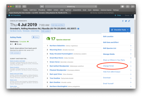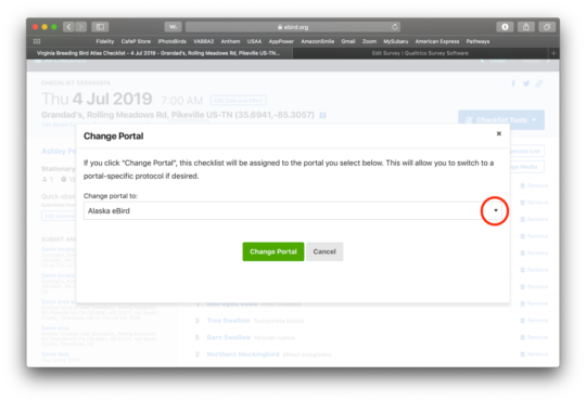 Troisième étape : Un nouvel écran apparaît avec un autre menu déroulant. Cliquez sur la flèche à droite (encerclée ci-dessous) et faites défiler jusqu'au bas de la liste du portail, où vous verrez l'"Atlas des oiseaux nicheurs de Virginie". Sélectionnez cette option, cliquez sur le bouton vert "changer de portail" et c'est parti !