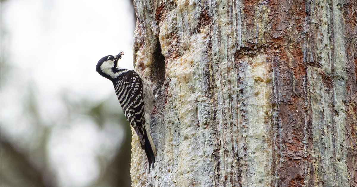 Neuf mois plus tard, Emma Belling a braqué sa lunette d'observation sur un petit oiseau haut perché dans les arbres. En tant que responsable du département des ressources fauniques de Virginie (DWR) de la zone faunique de Big Woods WMA, l'une de ses tâches consiste à dénombrer les populations de pics à tête rouge (RCW). Elle avait vu et entendu un TCR qu'elle soupçonnait être l'un des oisillons de l'année précédente, mais elle ne l'avait pas confirmé en identifiant l'individu par ses bagues aux pattes. "Au début, je n'ai pu voir que la patte droite, et j'ai pu constater qu'il s'agissait d'une combinaison qui ne correspondait à aucun des autres oiseaux que j'avais l'habitude de voir", a-t-elle déclaré. "J'étais un peu excité. J'ai alors aperçu sa patte gauche et j'ai pensé qu'il s'agissait peut-être de notre oisillon. Lorsque [Matt Kline, responsable des terres et de l'accès de la région DWR 1 ] et moi-même sommes allés le confirmer, j'étais très enthousiaste. Nous étions ravis !