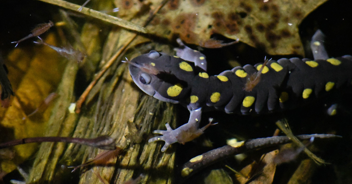 À quelques mètres du bord de la piscine, le faisceau d'une lampe frontale aperçoit un individu en route, les yeux sombres brillants - un signe positif. Un rapide coup d'œil à la piscine permet d'en savoir plus. Des centaines de salamandres tachetées(Ambystoma maculatum), silencieuses mais frappantes, se tortillaient dans la nuit autour des débris de bois, de l'herbe inondée et les unes des autres. Il s'agit de grandes salamandres, qui peuvent atteindre une longueur de 6 à 10 pouces, avec un dos noir laiteux parsemé de taches jaunes brillantes, et un ventre allant du gris au violet, ce qui les rend faciles à repérer. Tous étaient réunis pour participer à l'une des nuits les plus importantes de leur année.