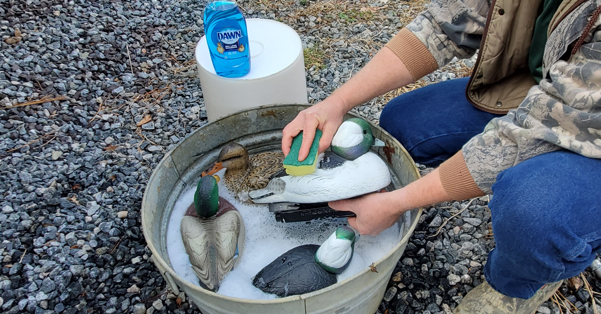 Lorsque vous lavez des appelants, des cuissardes ou d'autres équipements couverts de boue ou de sang, utilisez un détergent tel que le savon à vaisselle Dawn, qui n'est pas agressif et n'endommage pas la peinture ou ne décolore pas les matériaux. Pensez à mettre de l'eau chaude savonneuse dans une baignoire et à laisser tremper les leurres pendant une heure ou deux pour décoller les saletés les plus tenaces. Veillez à rincer tout le savon lorsque vous avez terminé. Commencez par une éponge douce et, si nécessaire, utilisez une brosse à poils doux, en veillant à ne pas frotter la peinture. Pendant que vous nettoyez les leurres, démêlez et défaites les nœuds des lignes des leurres et enlevez les mauvaises herbes que vous aviez sur les lignes. Si vos appelants ont besoin d'une retouche de peinture, vous le verrez maintenant et vous pourrez prendre le temps de le faire avant la reprise de la saison.