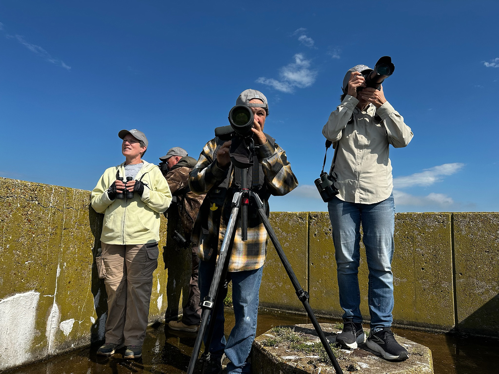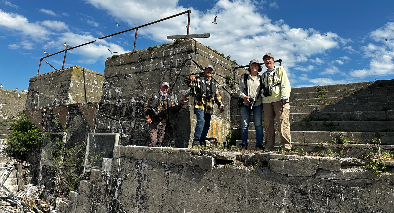 L'équipe gagnante de la Virginia Birding Classic 2024, The Twitchers ([de gauche] Steve Myers, Amy Meyers, June McDaniels et Andrew Baldelli), a pu profiter d'une journée d'observation des oiseaux sur le site de nidification des oiseaux de mer de Fort Wool grâce à sa victoire.
