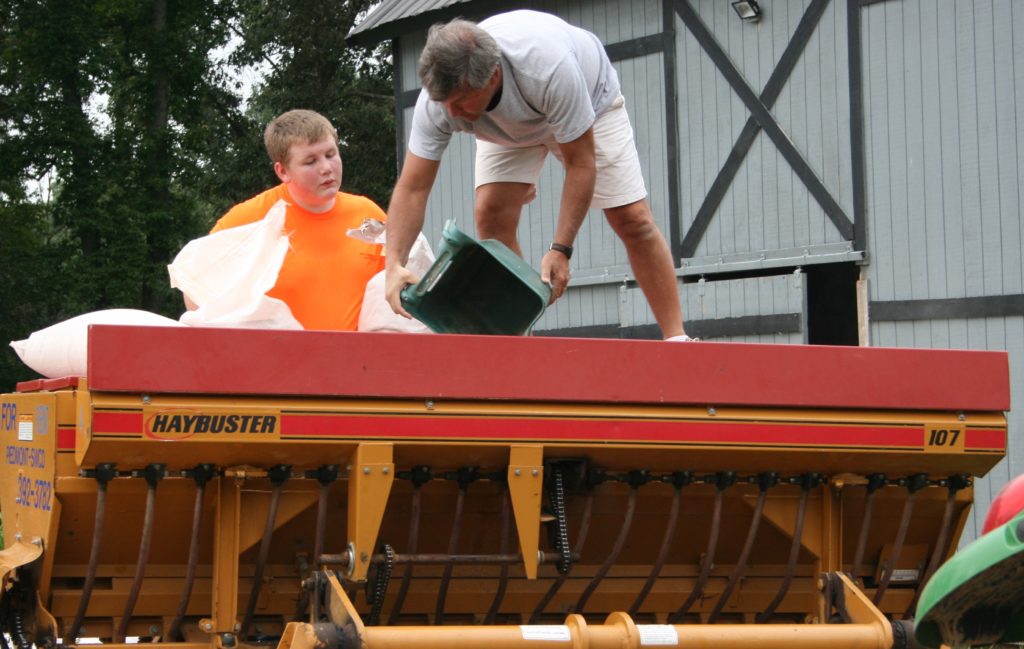 Maintenant que vous avez cultivé le sol, il est temps de semer vos graines. Il y a plusieurs années, notre club a acheté un épandeur à la volée de 300 livres. Cet épandeur peut être tiré avec le tracteur ou derrière un VTT. Cela évite de parcourir le champ avec un épandeur manuel.