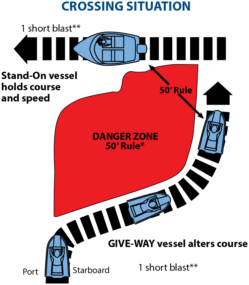 When two power-driven vessels are crossing, the vessel which has the other on her starboard side shall give way and keep out of the way and avoid crossing ahead (in front) of the other vessel.