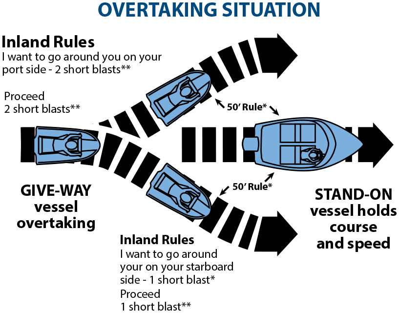If you are being overtaken (passed), you are the stand-on vessel and should maintain your course and speed. The vessel overtaking you should notify an intent to pass by making an appropriate sound signal. One short blast of the horn or whistle means “I intend to overtake you on your starboard side” and 2-short blasts means “I intend to overtake you on your port side”.