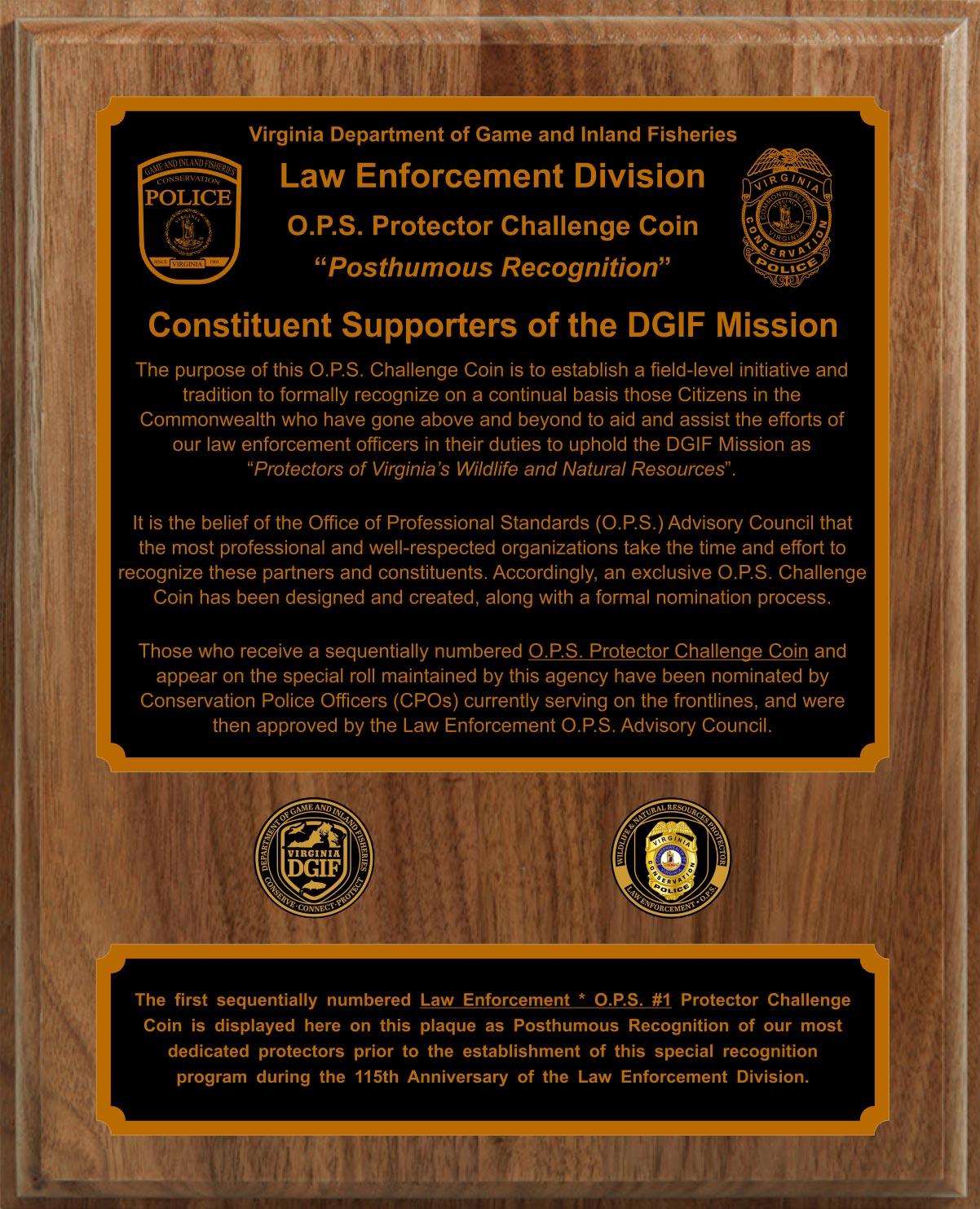 La première pièce d'identification du protecteur de l'application de la loi ⭑ O.P.S. #1 est exposée au siège de la DWR en guise de reconnaissance posthume de nos protecteurs les plus dévoués avant la mise en place de ce programme spécial de reconnaissance lors du 115e anniversaire de la division de l'application de la loi.