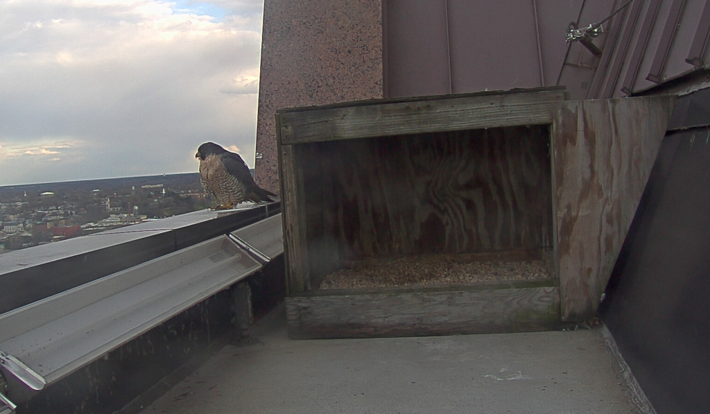 Cependant, la femelle n'a pas été très présente et lorsqu'elle l'a été, elle a montré peu d'intérêt pour le nichoir - elle a été observée pour la dernière fois sur la caméra le 8mars pendant un bref moment alors qu'elle était perchée sur le parapet de la corniche. Les biologistes du DWR se sont rendus aujourd'hui au centre-ville de Richmond pour enquêter sur la situation.
