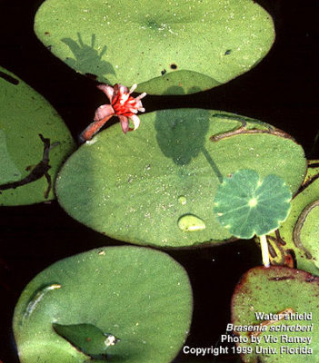Se développe à partir de fines racines noires et fibreuses ancrées dans le substrat. Une substance muqueuse ou gélatineuse recouvre toutes les parties immergées de la plante. Les tiges et la face inférieure des feuilles elliptiques sont pourpres, tandis que la partie supérieure des feuilles est verte. Les feuilles peuvent atteindre 5 pouces de long et 3 pouces de large.