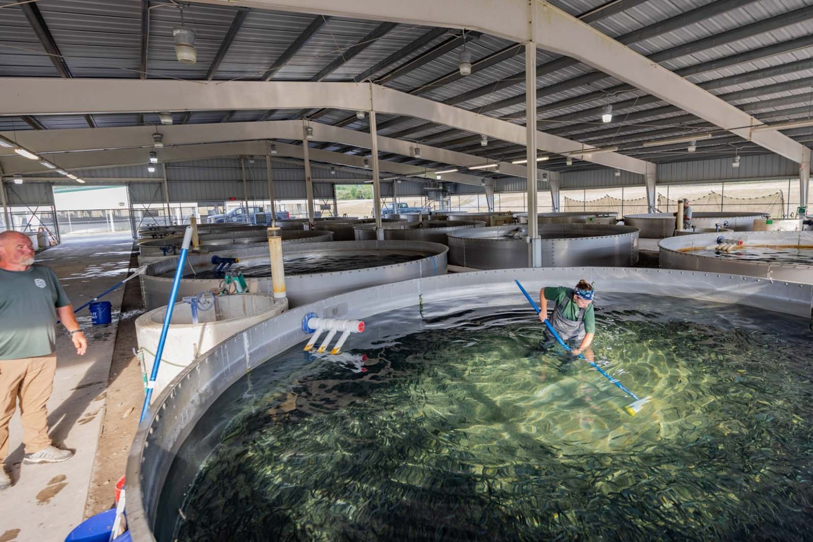 Une fois que l'eau quitte les cuves de culture, elle passe par une série de filtres avant d'arriver dans une installation de traitement des eaux usées. L'eau est ensuite réutilisée dans les bassins d'élevage ou rejoint Spring Run, un magnifique ruisseau à truites, où il n'est pas rare d'attraper une truite de rivière ou une truite arc-en-ciel de la taille d'un trophée.