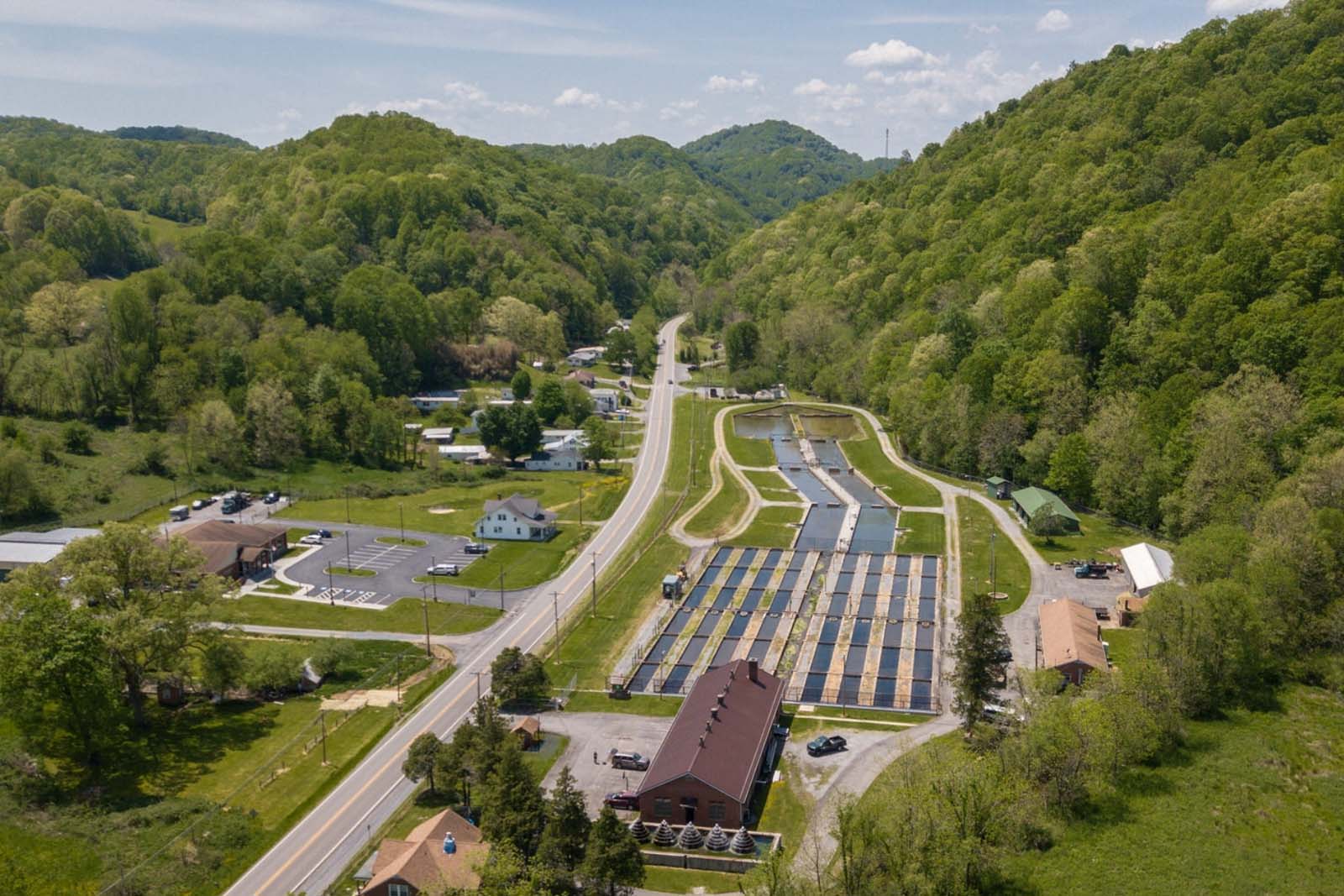 L'alimentation en eau de l'écloserie se fait par gravité dans des tuyaux en fonte 12″ à partir de quatre sources différentes et d'un barrage de dérivation sur Staley's Creek. Le bâtiment de l'écloserie pour les alevins est entièrement alimenté par de l'eau de source qui est aérée sur six tours en aluminium à l'extérieur du bâtiment. L'eau de Staley's Creek, acheminée par gravité, se mélange à l'eau de source à la sortie du bâtiment du couvoir pour alimenter les bassins de production situés à l'extérieur. Cela donne à l'écloserie un volume d'eau total d'environ 1,500 gallons par minute. La température de l'eau au printemps varie de 50 degrés F en hiver à 56 degrés F en été. La température de l'eau du ruisseau varie de 38 degrés F en hiver à 70 degrés F en été.