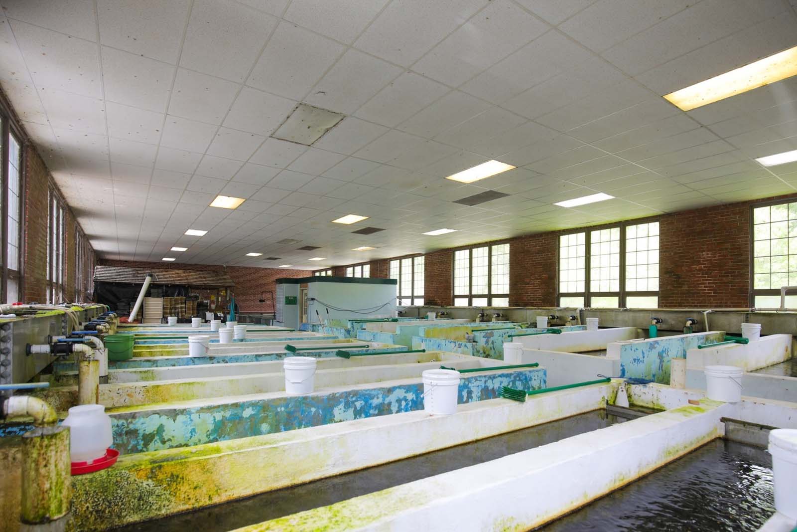 Le bâtiment de l'écloserie se compose de 14 tours verticales d'incubation d'œufs et de 23 canaux d'élevage en béton. La production extérieure se compose de 54 et de six grands bassins d'élevage.