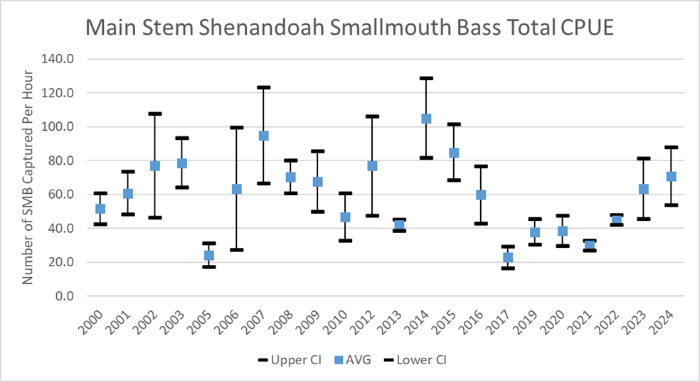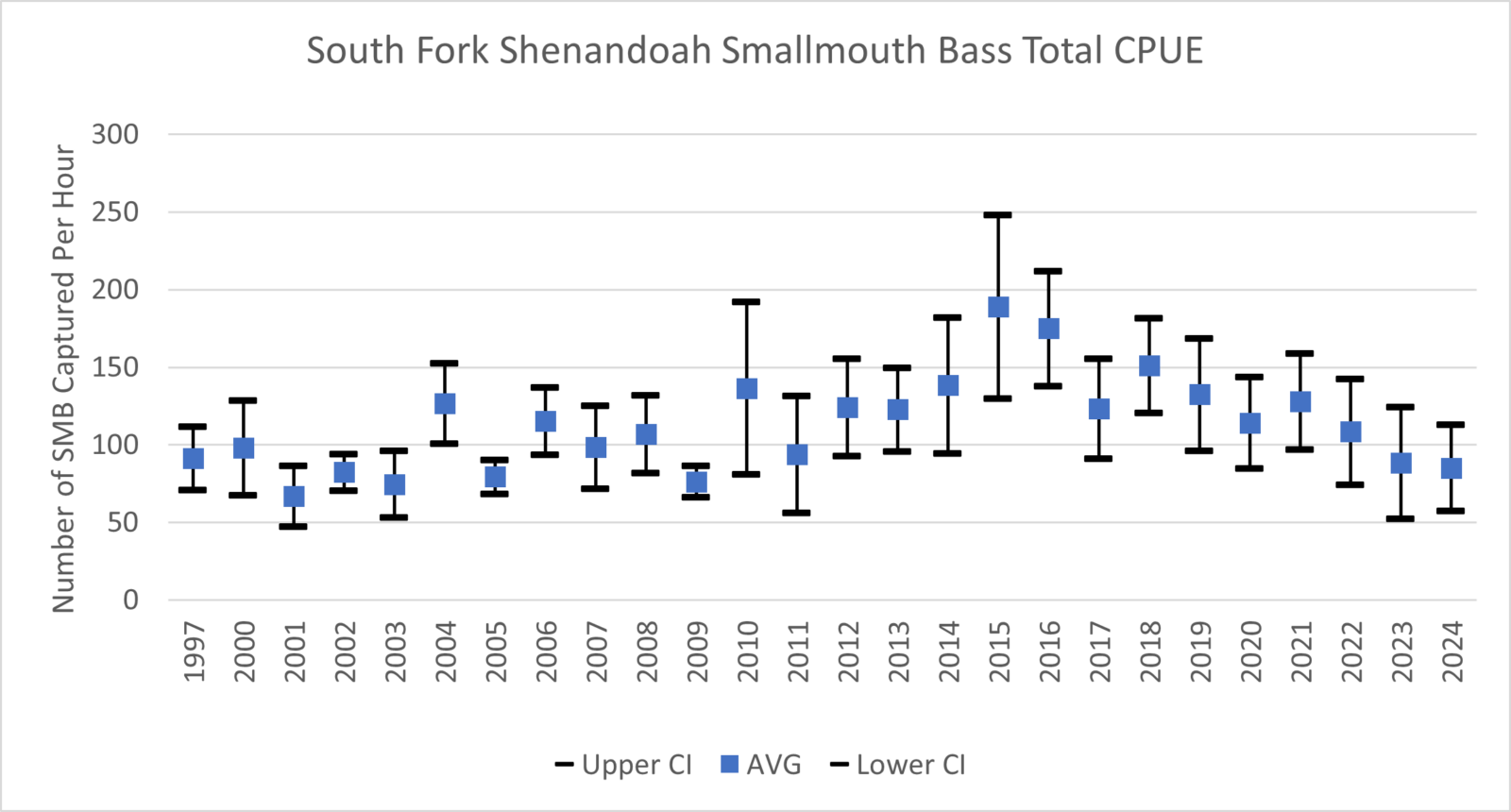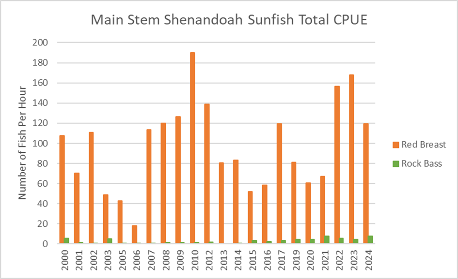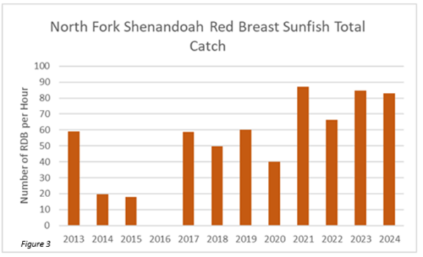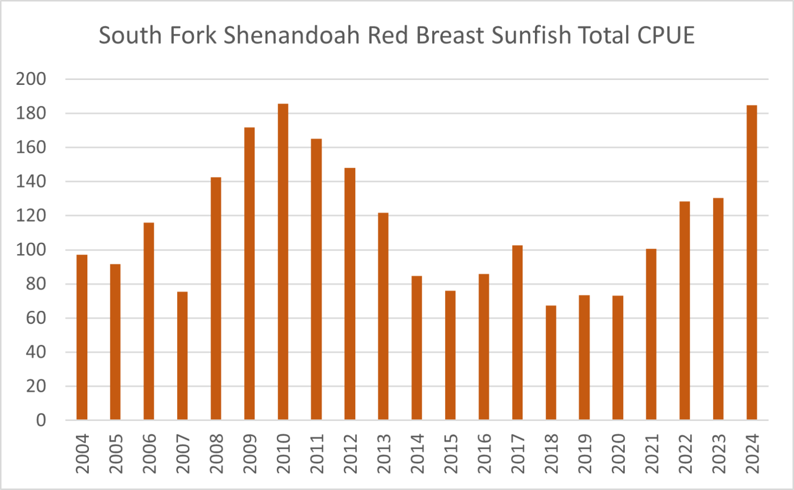 La South Fork Shenandoah River est connue par les pêcheurs comme une pêcherie "numérique", ce qui signifie que les pêcheurs peuvent s'attendre à attraper une quantité raisonnable de bass et de sunfish n'importe quel jour. Au cours de notre échantillonnage d'automne 2024, nous avons collecté 710 des achigans à petite bouche sur neuf sites d'échantillonnage à un taux de 85 poissons par heure (Figure 1). Environ 26 pour cent d'entre eux mesuraient 11 pouces ou plus, 6 pour cent dépassaient 14 pouces et 1 pour cent mesuraient 17 pouces et plus. Notre taux de capture était presque identique à celui de l'échantillon 2023 et légèrement inférieur à la moyenne à long terme. Malgré la baisse récente du taux de capture, la population semble favorable, avec un bon nombre de poissons de qualité. Dans l'ensemble, notre échantillon a produit un grand nombre de petites bouches de 8à11 pouces, résultat direct d'un frai supérieur à la moyenne à 2021. Cette situation est assez typique de la fourchette sud, avec des taux de capture fantastiques et un nombre inférieur de poissons de bonne taille. Nos taux de capture actuels s'amélioreraient si nous connaissions un frai supérieur à la moyenne à l'adresse 2025. Au cours des deux dernières années, nous avons connu un succès de frai très faible en raison des conditions de sécheresse. Les juvéniles de petites bouches ont du mal à rejoindre la population lorsque les eaux sont extrêmement hautes pendant le frai au printemps ou extrêmement sèches pendant l'été. Nous espérons que les conditions météorologiques seront plus favorables au cours de l'année à venir, ce qui contribuera à accroître la population.