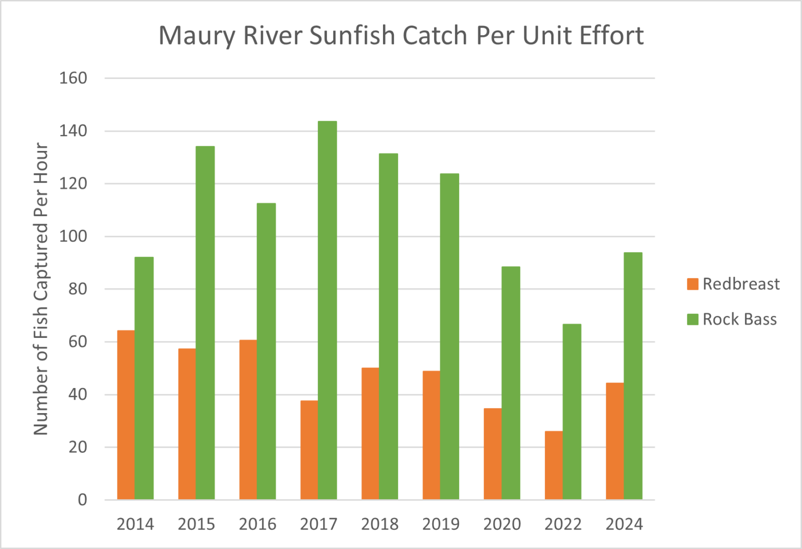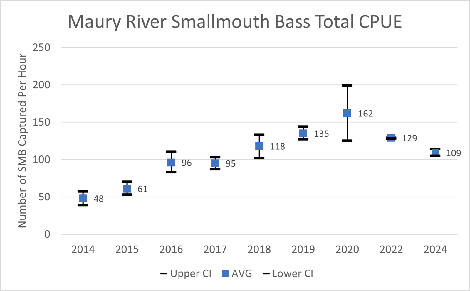 La rivière Maury est l'une des rivières les plus régulières de l'État en termes de production de bar à petite bouche. Nous avons enregistré une légère baisse du taux de capture ce printemps, mais cette baisse peut être attribuée en grande partie aux conditions d'eau exceptionnellement basses. Les poissons ont tendance à éviter de se faire capturer lorsque l'eau est claire et se dirigent vers des eaux plus profondes où ils sont hors de notre portée. Quoi qu'il en soit, notre taux de capture se situait dans la moyenne à long terme (figure 1).