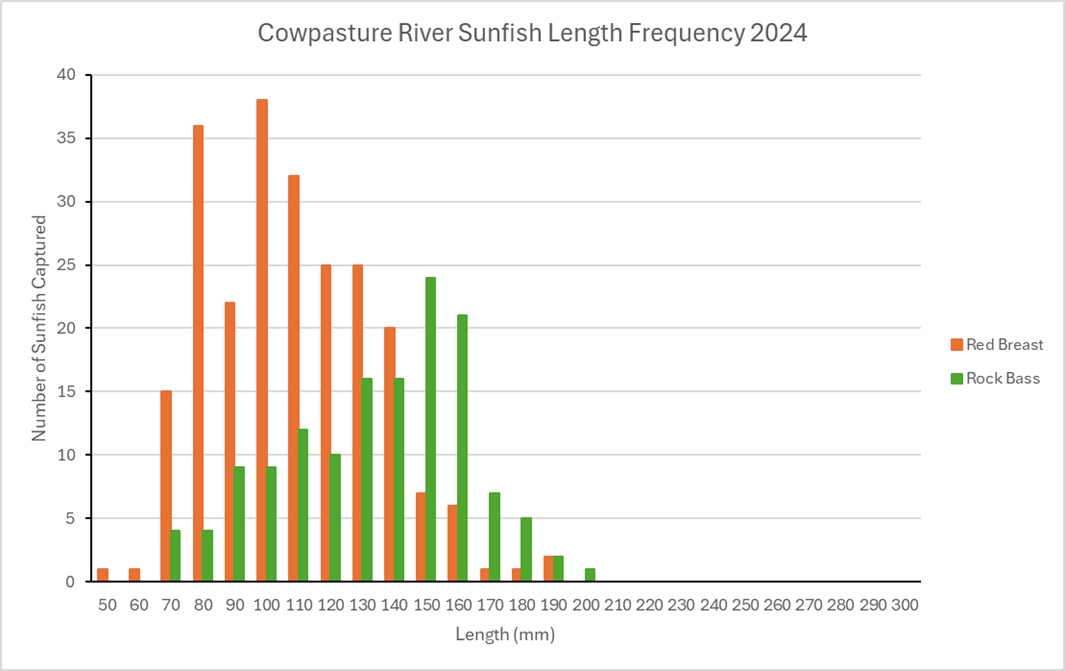 La rivière Cowpasture est l'une des rivières les plus pittoresques de l'ouest du Commonwealth. Lorsque les niveaux d'eau sont modérés, les pêcheurs peuvent s'attendre à attraper un ensemble varié de poissons. Au cours de l'automne 2024, les biologistes ont échantillonné quatre sites et ont collecté des espèces sur 20. La population de petites bouches est en difficulté. Comme la rivière James, elle souffre depuis plusieurs années d'un faible taux de frai. Par conséquent, très peu de poissons de qualité (poissons > 11 pouces) sont présents dans le système (Figure 1).