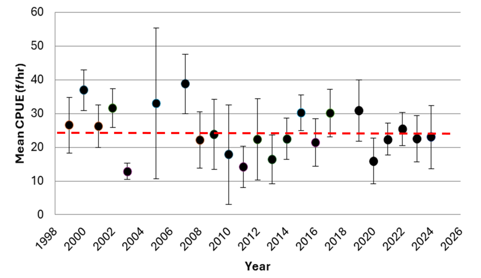 La pêche à l'achigan à petite bouche dans la rivière Staunton à 2025 devrait rester moyenne à bonne. Alors que les classes d'âge 2023 et 2024(mesurées par la densité de jeunes bars dans nos échantillons) étaient inférieures à la moyenne, les classes d'âge supérieures à la moyenne produites à 2017, 2019, 2021 et 2022 permettront de maintenir des taux de capture constants de poissons de qualité pour les années à venir. Les taux de capture lors de l'échantillonnage automnal par pêche électrique montrent que les densités de population pour la dernière décennie sont égales ou supérieures à la moyenne et figurent parmi les meilleurs taux de capture des années 25 (voir le graphique ci-dessous). Les classes d'âge 2016- et 2020- ont été médiocres/moyennes et les fortes précipitations et les débits extrêmes de 2018 ont probablement entraîné une faible augmentation du nombre de poissons dans la pêcherie cette année-là. Les classes d'âge 2023- et 2024- étaient également légèrement inférieures à la moyenne, de sorte qu'une bonne classe d'âge est certainement nécessaire.