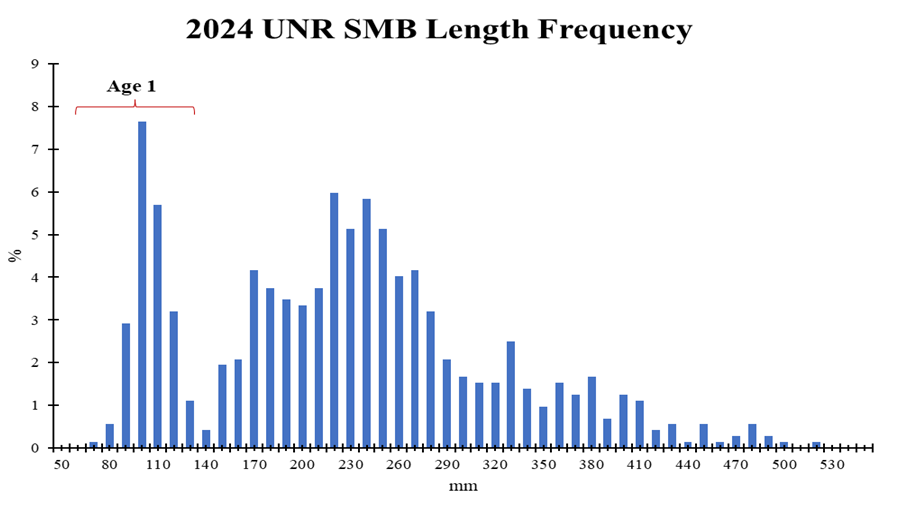 La tige principale est sur le point de revenir ! Lors de notre échantillonnage d'automne 2024, nous avons collecté 230 des achigans à petite bouche sur trois sites et observé un taux de capture de 71.1 poissons par heure. Le taux de capture du fleuve est en hausse depuis trois années consécutives (figure 1). Environ 37 pour cent des petites bouches mesuraient 11 pouces ou plus, et 20 pour cent dépassaient 14 pouces. Cinq pour cent ont mesuré 17+ pouces. Le Main Stem souffre de problèmes de santé des poissons similaires à ceux de la South Fork, ainsi que d'un faible taux de frai. Toutefois, les frayères de 2022 et 2023 se situaient dans la moyenne à long terme de 12 poissons par heure, ce qui a contribué à améliorer nos taux de capture. Notre taux de capture de jeunes de l'année ( 2024 ) a été inférieur à la moyenne à long terme, mais un grand nombre de juvéniles restent dans le système. C'est de bon augure pour l'avenir de la pêche. Dans l'ensemble, nous avons observé un bon mélange de classes de taille, bien qu'en faible nombre. Les pêcheurs peuvent s'attendre à un bon nombre de poissons pré-fente d'une longueur de 8à11 pouces, ce qui est le résultat d'un bon frai à 2022. Il y a également une variété de poissons de qualité allant de 14à18+ pouces. Le nombre de poissons de qualité reste supérieur à la moyenne à long terme, à savoir 16 poissons par heure.