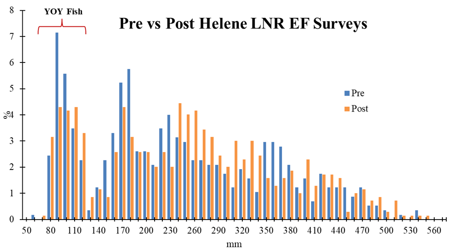 Graphique de fréquence des longueurs des poissons collectés par 2024 lors des campagnes de pêche électrique d'automne sur le cours inférieur de la rivière New. Le premier pic indique un bon nombre de poissons de la classe d'âge 2024avant et après l'ouragan Helene.