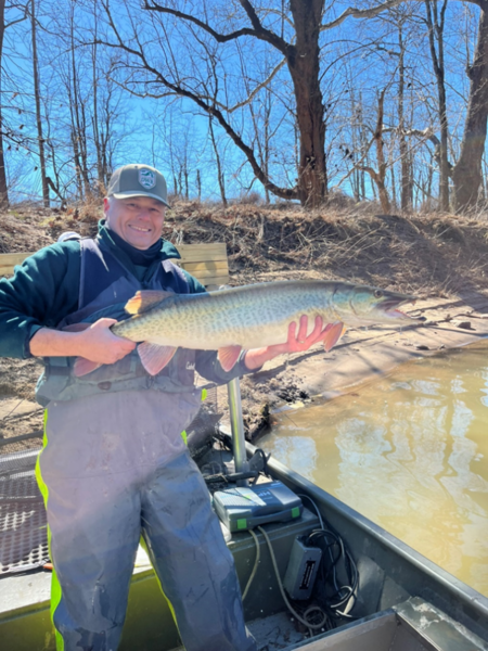 Le doré jaune est arrivé. Au printemps 2014, le DWR a commencé à stocker chaque année des alevins de doré dans la rivière Shenandoah afin de compléter la population naturelle et d'augmenter le nombre de doré présent. Au printemps de 2024, le Main Stem a reçu 20,023 alevins de doré. Les pêcheurs devraient continuer à bénéficier de taux de capture réguliers et d'un plus grand nombre de gros dorés sur 2025. Au cours de notre échantillonnage de janvier, nous avons capturé 41 dorés à un taux de 11.7 poissons par heure, ce qui correspond à la moyenne à long terme. Au cours de la montaison de février, les biologistes et les techniciens ont manipulé 54 poissons (taux de capture = 37.8 par heure). Le doré jaune mesurait en moyenne 21 pouces, la plus grande femelle atteignant 30 pouces. La plupart des poissons échantillonnés étaient de taille légale ou supérieure. Nous continuons à rencontrer des pêcheurs qui s'intéressent de plus en plus à cette pêche, alors planifiez bientôt une excursion dans la Shenandoah.