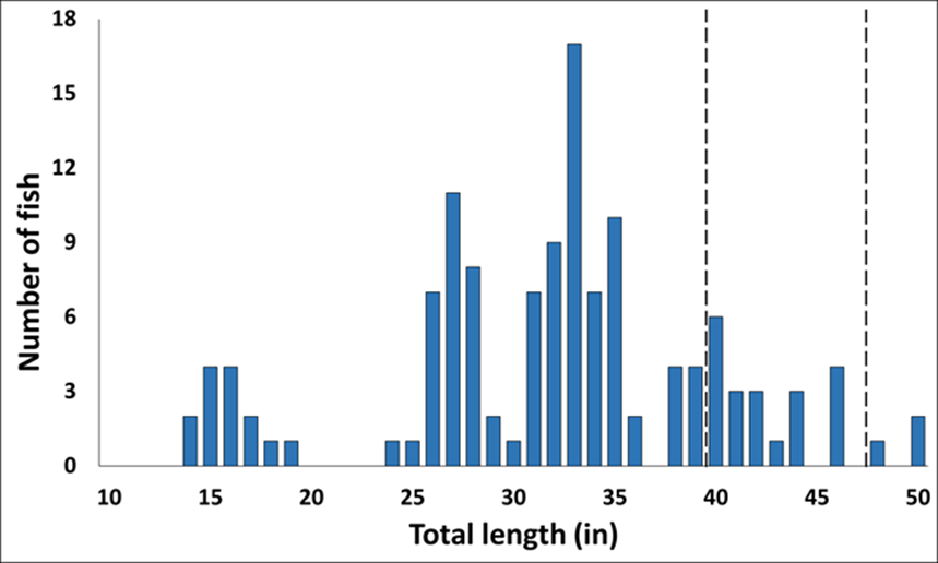 LFQ de Musky par pêche électrique hivernale dans le Lower New River à 2024. Les lignes en pointillé représentent les poissons dans la limite du créneau protégé de 40-48".