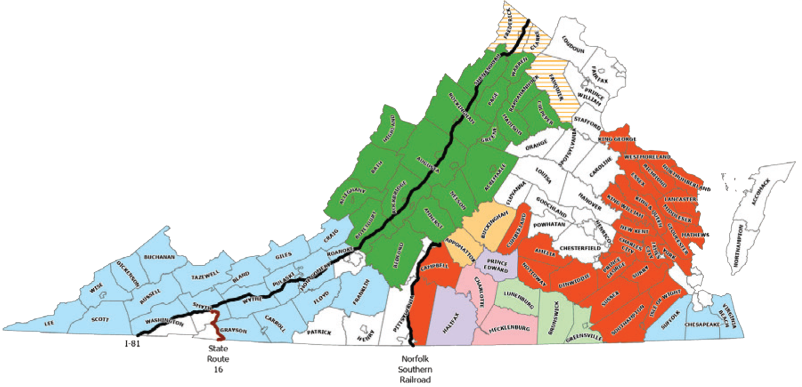 In the counties of Accomack, Campbell (West of Norfolk Southern Railroad), Caroline, Chesterfield, Fairfax, Fluvanna, Goochland, Grayson (West of State Rt 16), Hanover, Henrico, Henry, Loudon, Louisa, Northampton, Orange, Patrick, Pittsylvania (West of the Norfolk Southern Railroad), Powhatan, Prince William, Roanoke (South of 81), Smyth (West of State Rt. 16 and south of I-81), Spotsylvania, Stafford, Washington (South of 81)