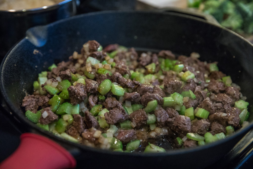 - Ajoutez les oignons hachés au steak et faites-les revenir jusqu'à ce qu'ils soient dorés.